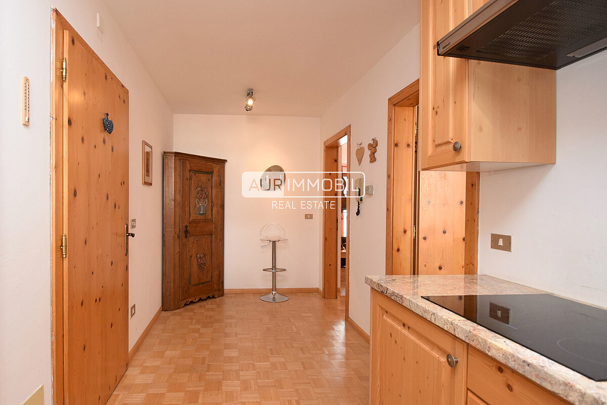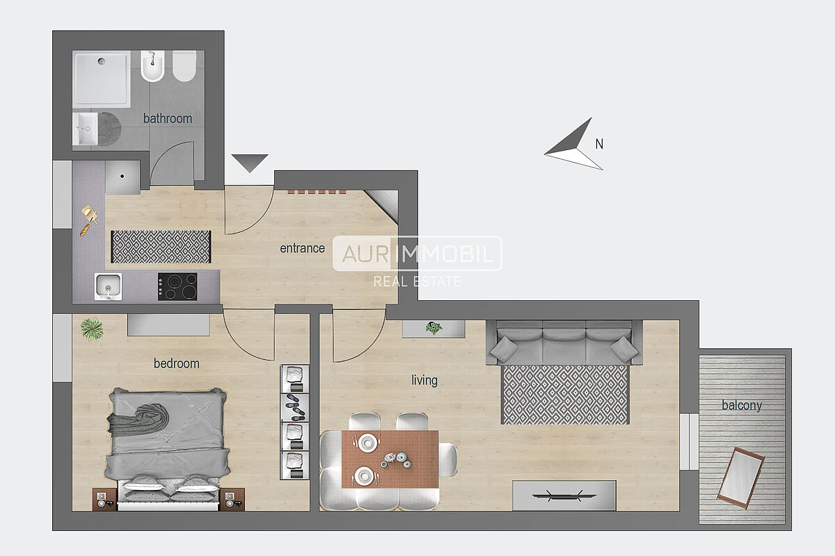 Il bilocale si trova al primo piano e comprende un atrio con cucina, un soggiorno con area pranzo, una camera da letto, un bagno e un balcone.