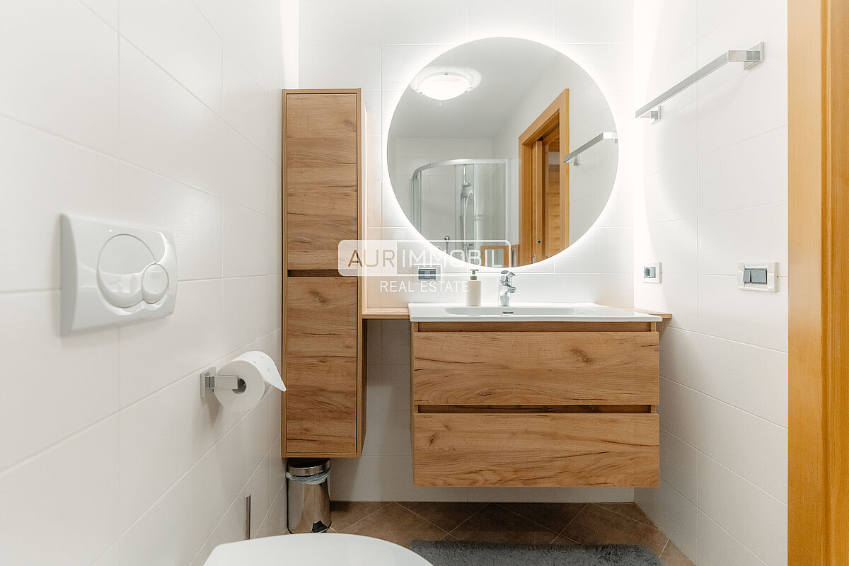 Gli ambienti sono impreziositi da arredi su misura in legno massiccio, realizzati con cura artigianale, che donano all’appartamento un’atmosfera calda e autentica, ideale per chi cerca comfort e qualità abitativa.