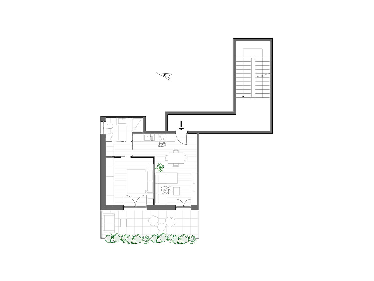 L’immobile accoglie con un ingresso che conduce a un luminoso soggiorno con angolo cottura, uno spazio funzionale e piacevole, perfetto per momenti di convivialità. La zona notte è composta da una spaziosa camera matrimoniale e da un bagno finestrato, garanzia di comfort e praticità.