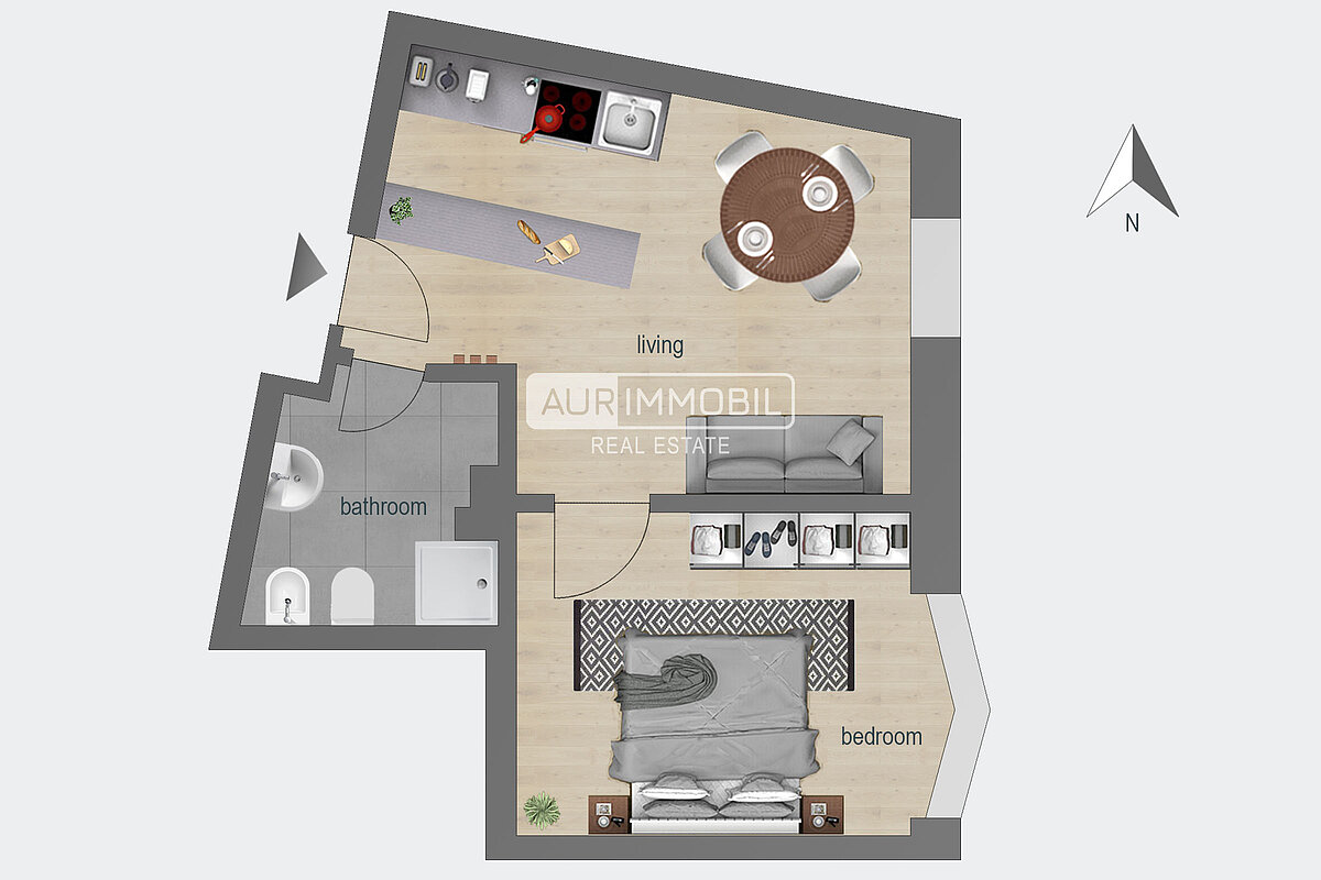 Il bilocale è composto da un ingresso, una zona giorno con angolo cottura, una camera da letto e un bagno.