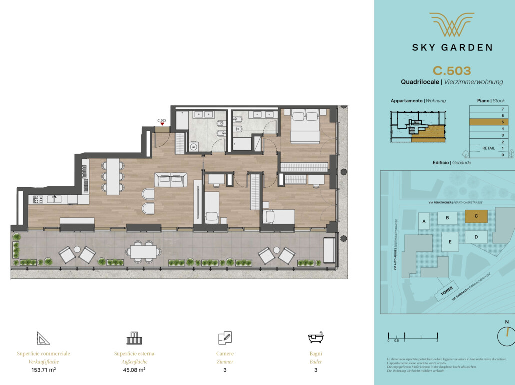 APPARTAMENTO C503 - Sykgarden C: Proponiamo in vendita nuovo quadrilocale con ampia terrazza al quinto piano - disposizione interna quanto segue: ingresso, soggiorno con cucina, 3 stanze da letto (di cui una con bagno padronale), bagno, WC e terrazza.