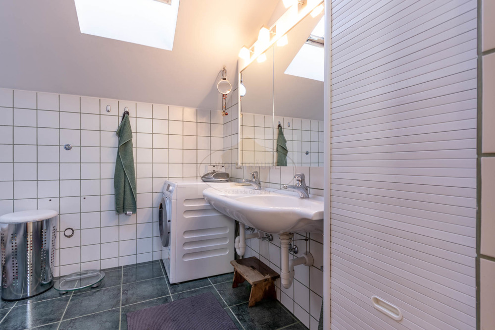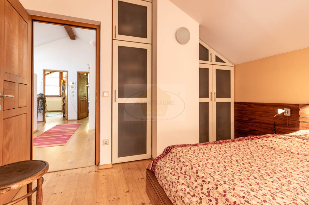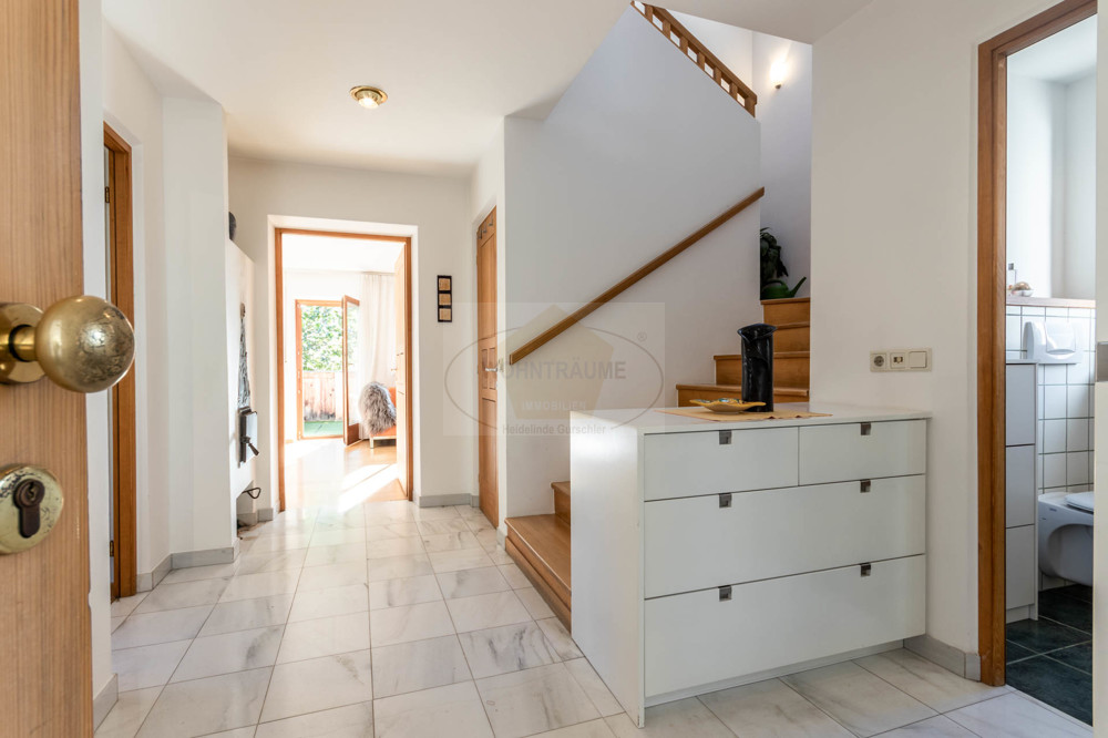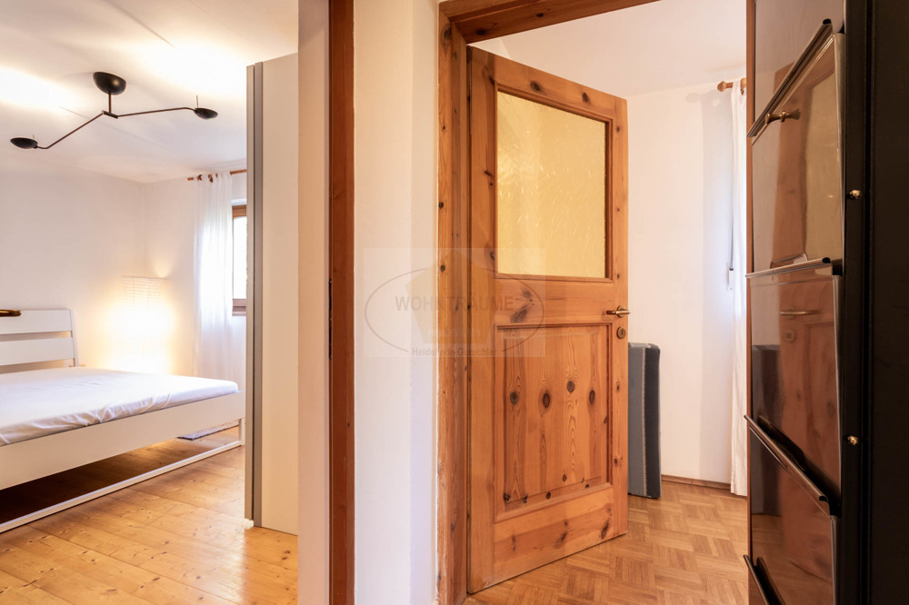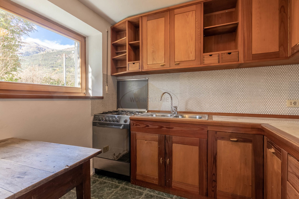 La scala esterna conduce poi all'ampio appartamento familiare al primo piano, dove si trovano una cucina molto accogliente con dispensa e sala da pranzo, un soggiorno con balcone esposto a sud e un WC per gli ospiti. La scala collegata internamente conduce all'ultimo piano, dove si trovano quattro camere da letto, un balcone esposto a sud e il bagno.