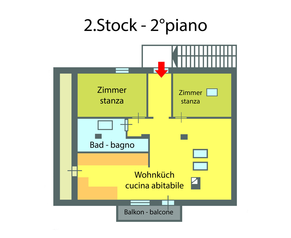 La seconda unità abitativa, con una superficie netta di circa 57 m², dispone di due camere da letto, un bagno e una cucina abitabile con accesso a un balcone esposto a sud. Questa unità è attualmente affittata a turisti e offre quindi un interessante potenziale di rendimento.