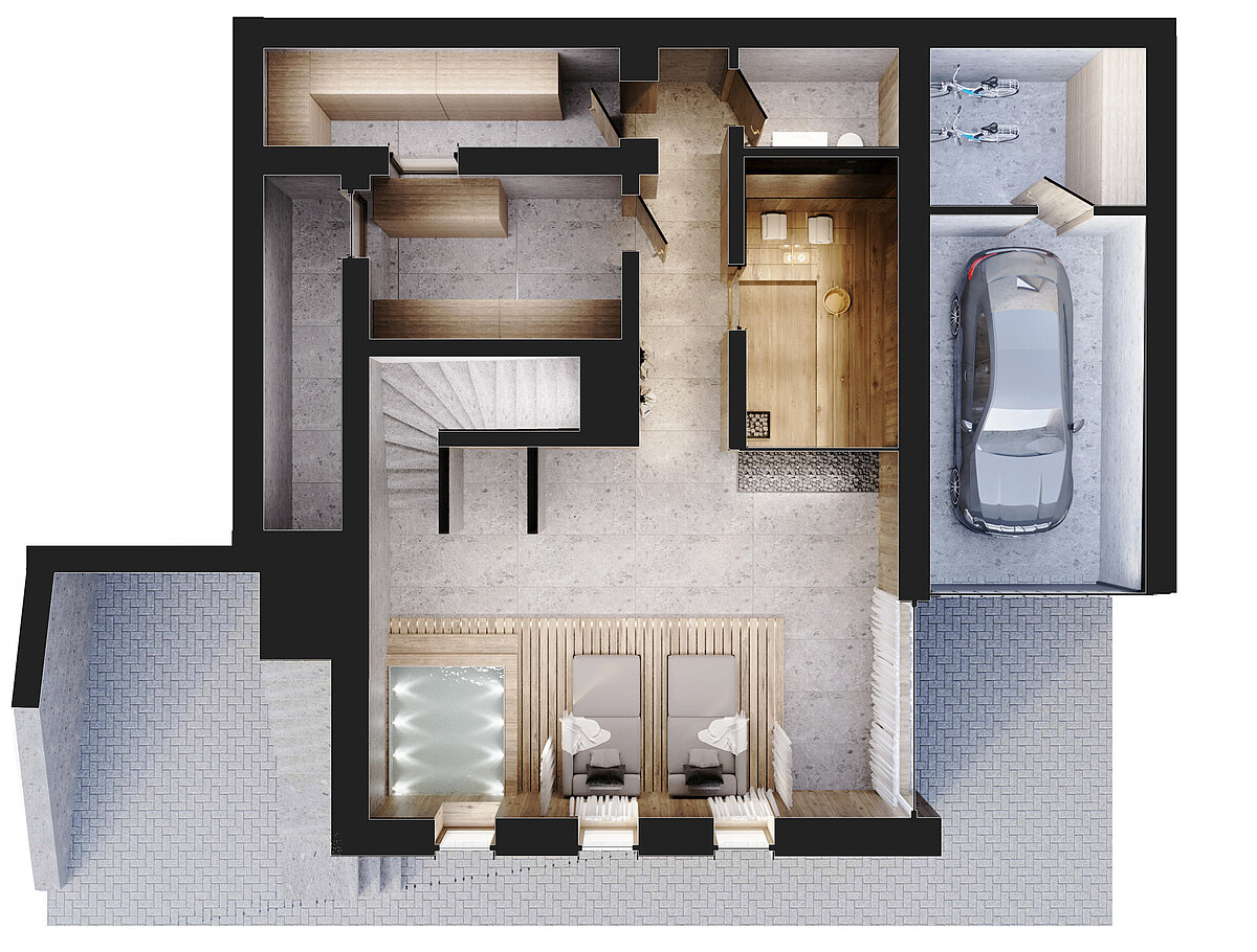 Alla proprietà appartengono due posti auto privati in garage e ulteriori posti auto all'aperto. Nel seminterrato, oltre al locale caldaia, si trovano utili spazi di deposito.