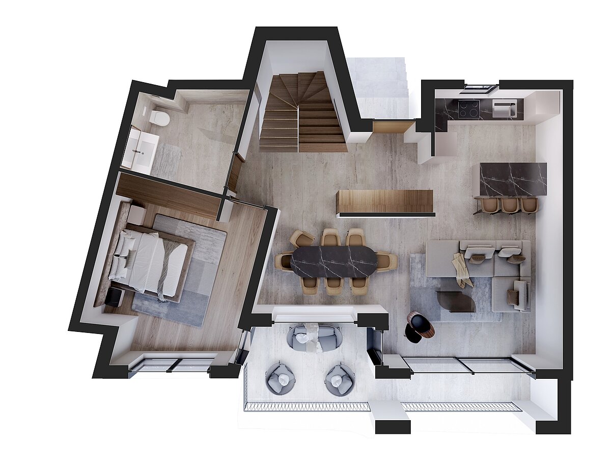 I rendering degli interni sono pensati per offrire uno sguardo ispirazionale su come potrebbe svilupparsi l’atmosfera degli ambienti. Non rappresentano una proposta di arredamento vincolante, ma più una suggestione stilistica e spaziale di quella che potrebbe diventare la vostra futura casa.
