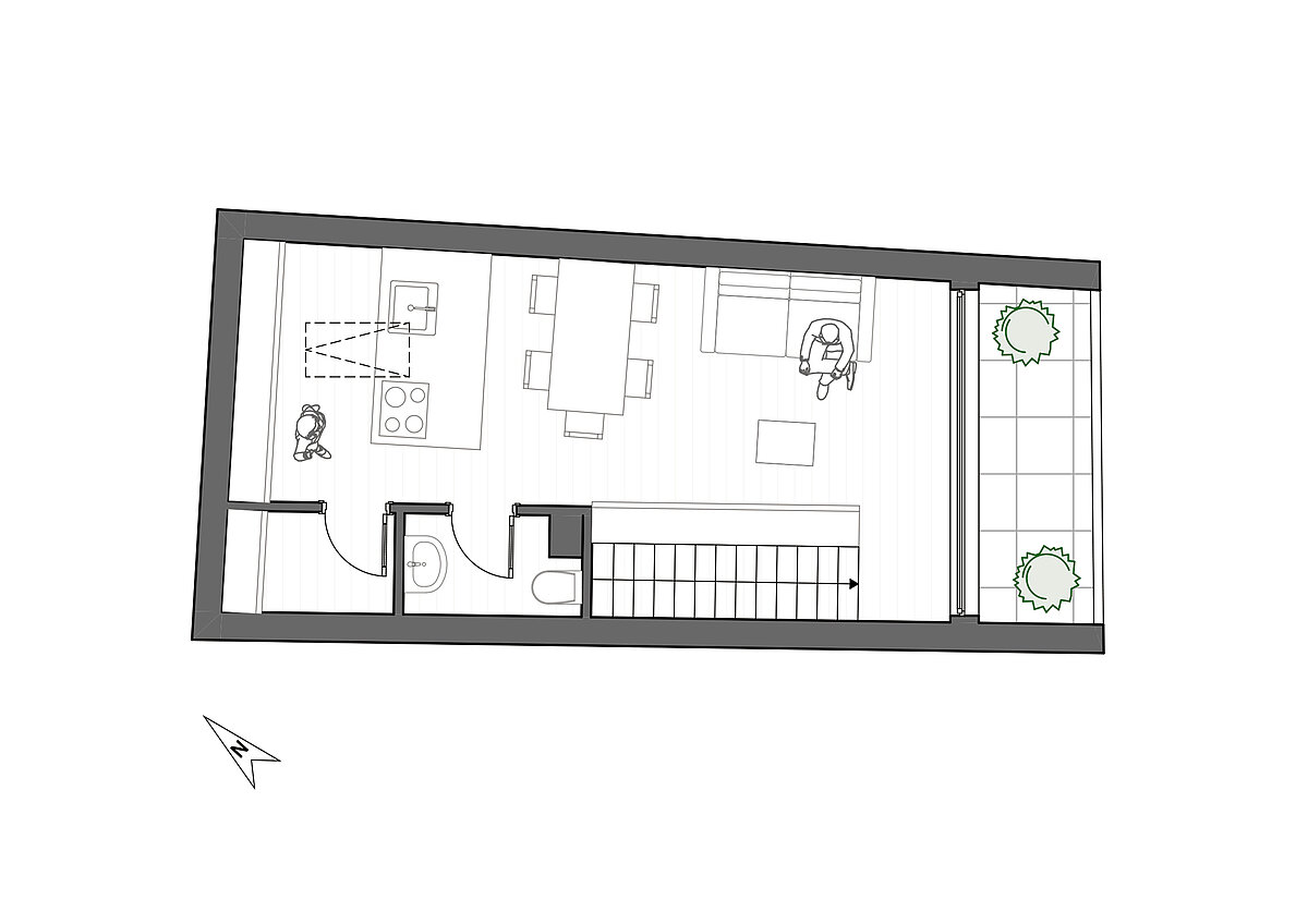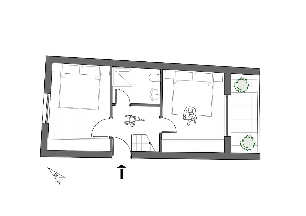 Al primo piano si trovano due camere da letto, un bagno moderno con WC, un ingresso e una loggia accogliente. Il secondo piano offre un pratico ripostiglio, un WC per gli ospiti e un’ampia zona giorno con cucina integrata, baciata dalla luce naturale, con accesso alla terrazza esposta a sud-est – perfetta per godersi il sole e momenti di relax all’aperto.