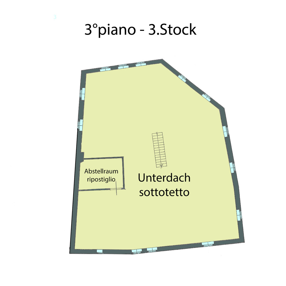 - Un ripostiglio e un ulteriore spazio abitativo, attualmente utilizzato come soffitta ma con possibilità di essere trasformato in un ulteriore spazio abitativo o in uno studio.
