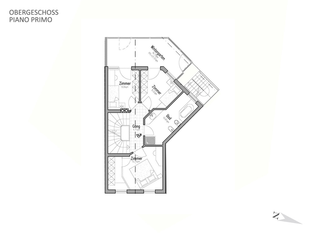 PRIMO PIANO Tre camere da letto, bagno spazioso, corridoio e giardino d’inverno luminoso con vista sul verde.
