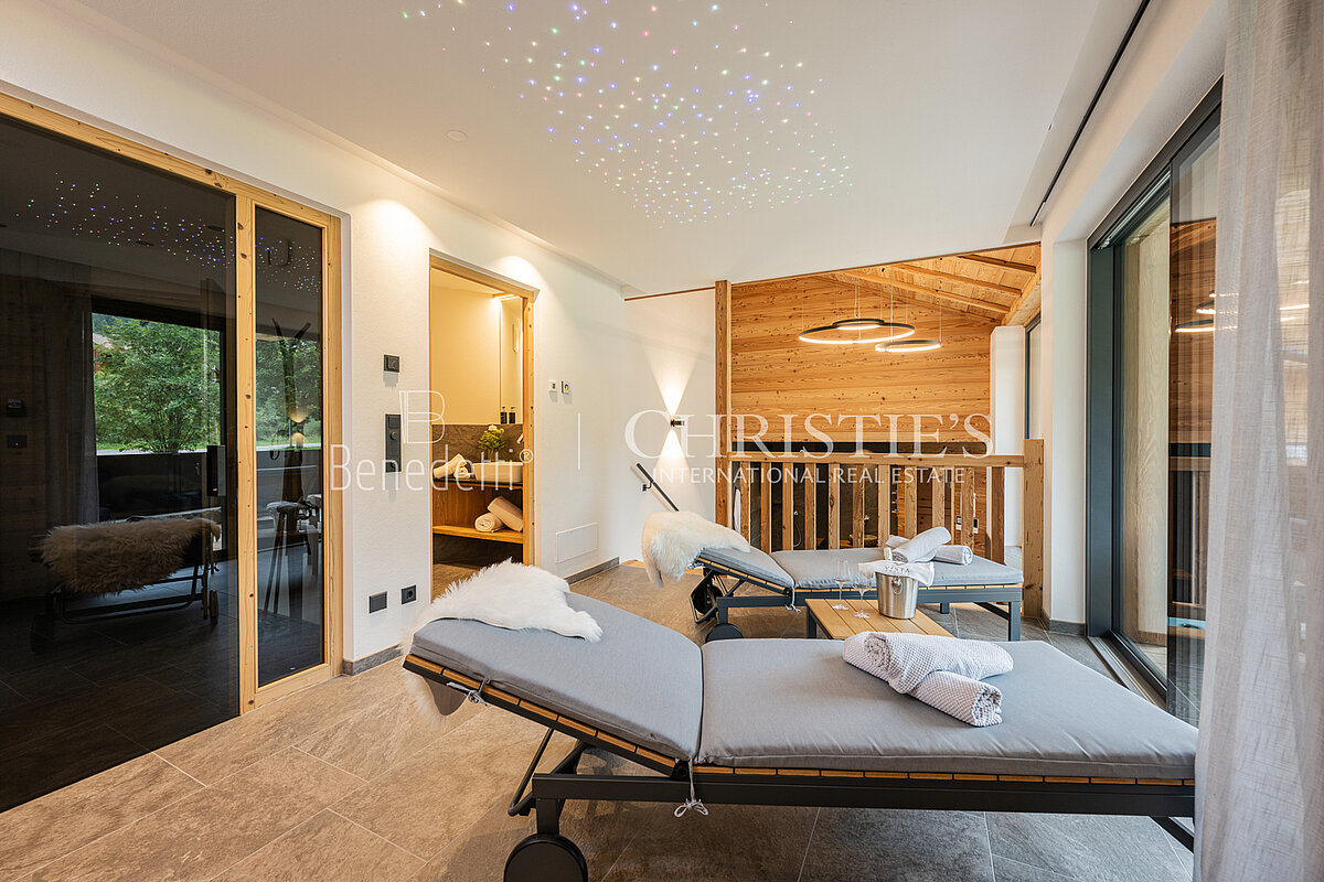 Al piano terra si trova una raffinata area benessere privata, perfetta per concedersi momenti di puro relax dopo una giornata in montagna. Qui si può usufruire di sauna, vasca idromassaggio ed una confortevole zona relax, con accesso anche ad un piccolo terrazzino esterno dove respirare l’aria fresca delle Dolomiti. A servizio dell’area wellness è inoltre presente un bagno, che rende questo spazio ancora più funzionale e pratico.