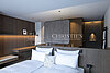 Il primo piano ospita la zona notte, composta da sei camere matrimoniali, ciascuna con bagno en suite. Ogni camera gode di accesso diretto all’ampio terrazzo esterno e al giardino, creando un dialogo continuo tra spazi interni ed esterni e garantendo luminosità e privacy.