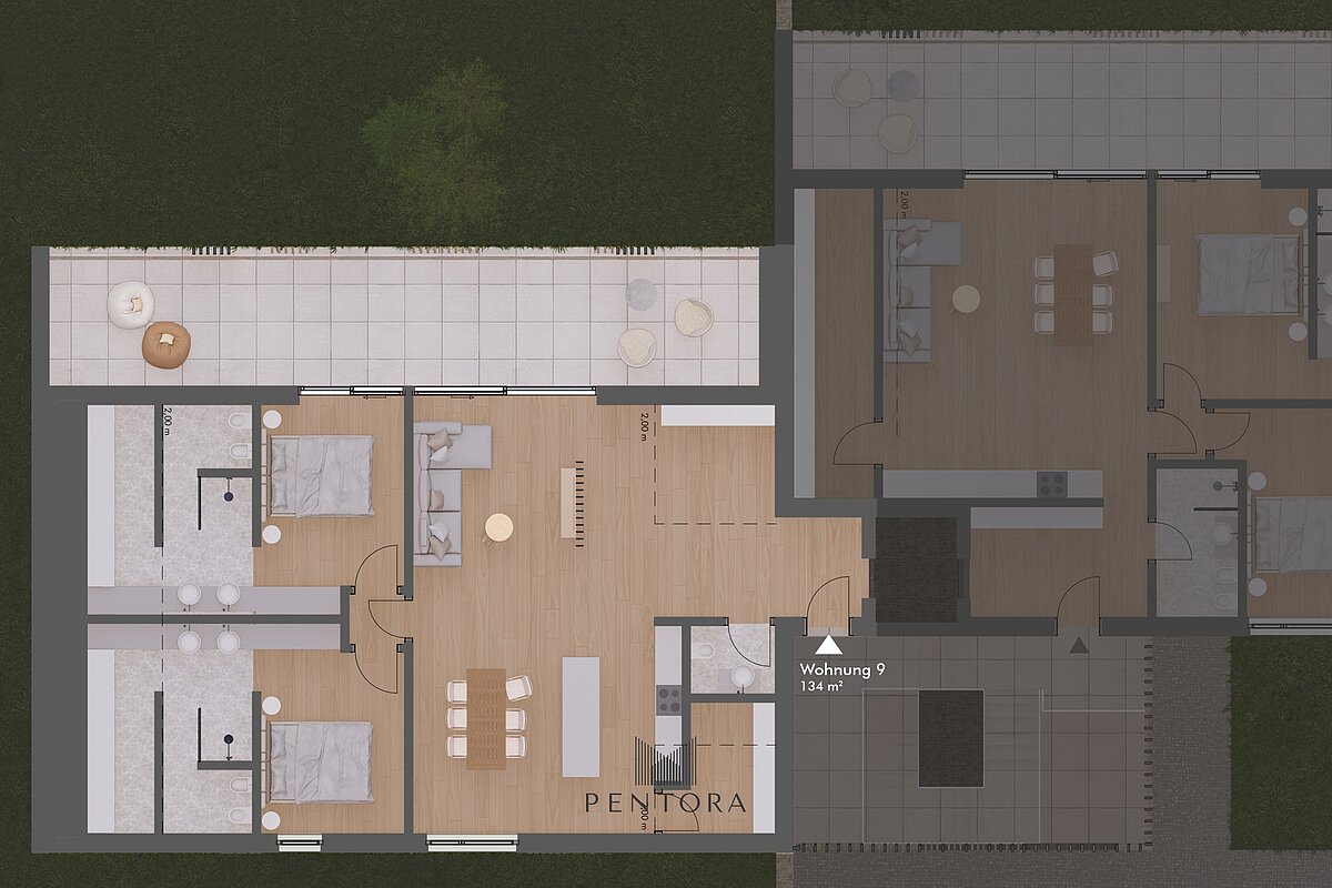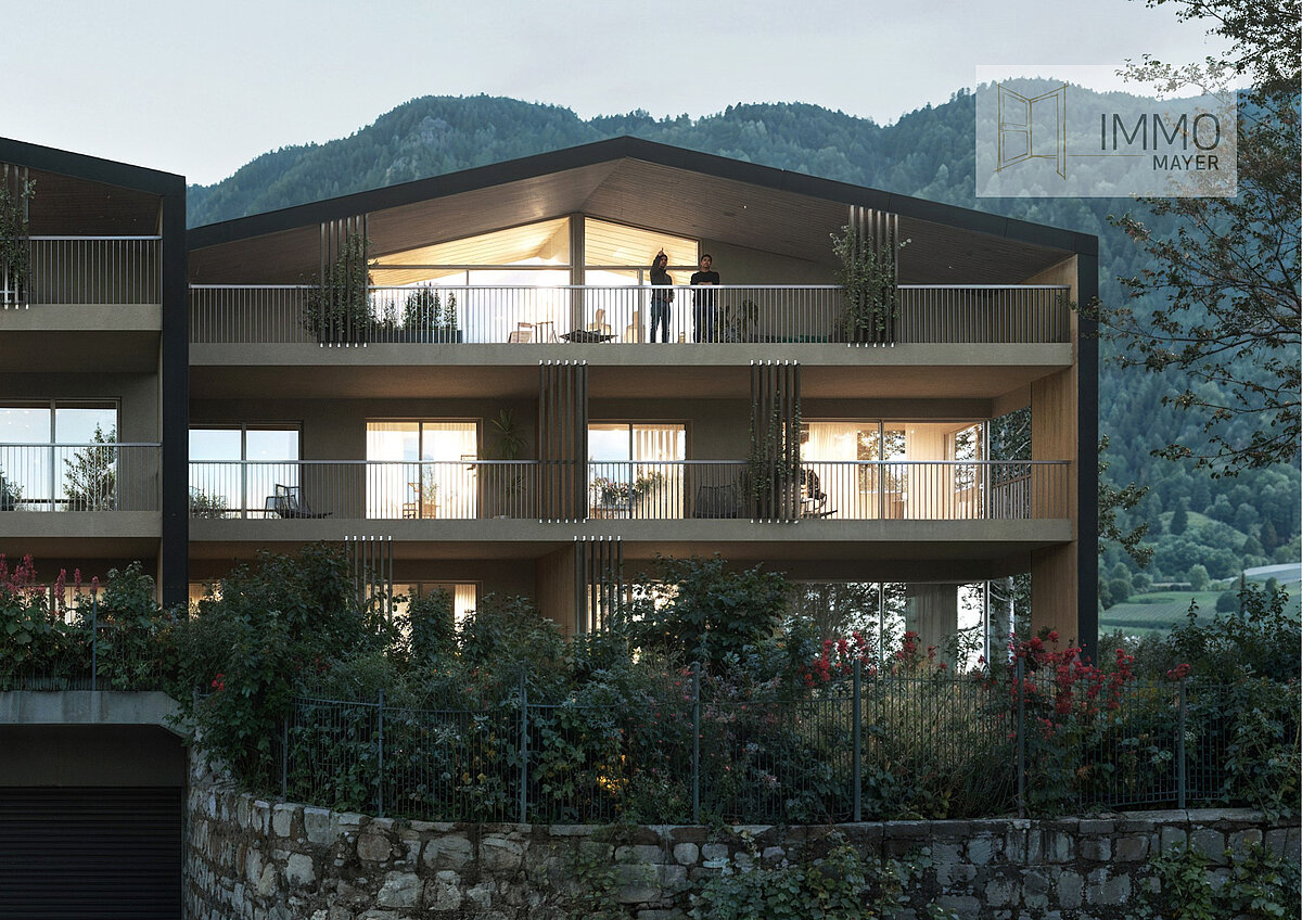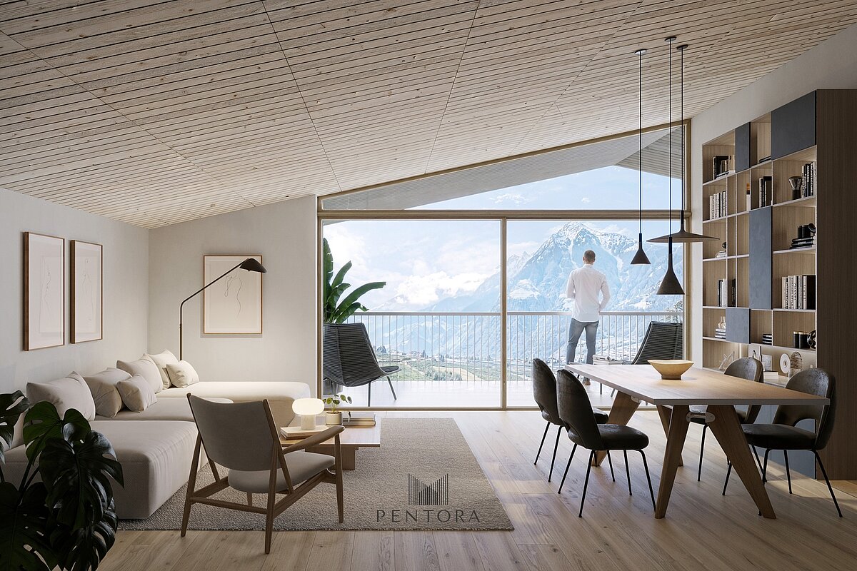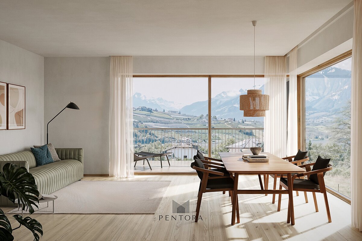 Questo ampio penthouse all’ultimo piano è pensato per chi desidera massima ampiezza, privacy e una vista libera su Merano. La posizione in lieve pendenza del progetto garantisce panorama su tutta la catena montuosa da ogni piano – qui sopra diventa una vera esperienza abitativa di altezza e leggerezza. L’appartamento offre ambienti interni generosi, una suddivisione chiara degli spazi e una grande terrazza panoramica come cuore della casa. Porte scorrevoli di grandi dimensioni portano luce e paesaggio all’interno, creando un living continuo tra dentro e fuori. Le finiture seguono lo standard premium dell’edificio: parquet in legno, superfici curate e pavimentazio¬ni esterne antigelo. Dal punto di vista tecnico il penthouse è predisposto per un comfort contemporaneo. La soluzione Smart Home su sistema KNX permette di gestire riscaldamento e schermature via smartphone o tablet; la sensoristica favorisce un’abitazione efficiente nello standard KlimaHaus A-Nature.