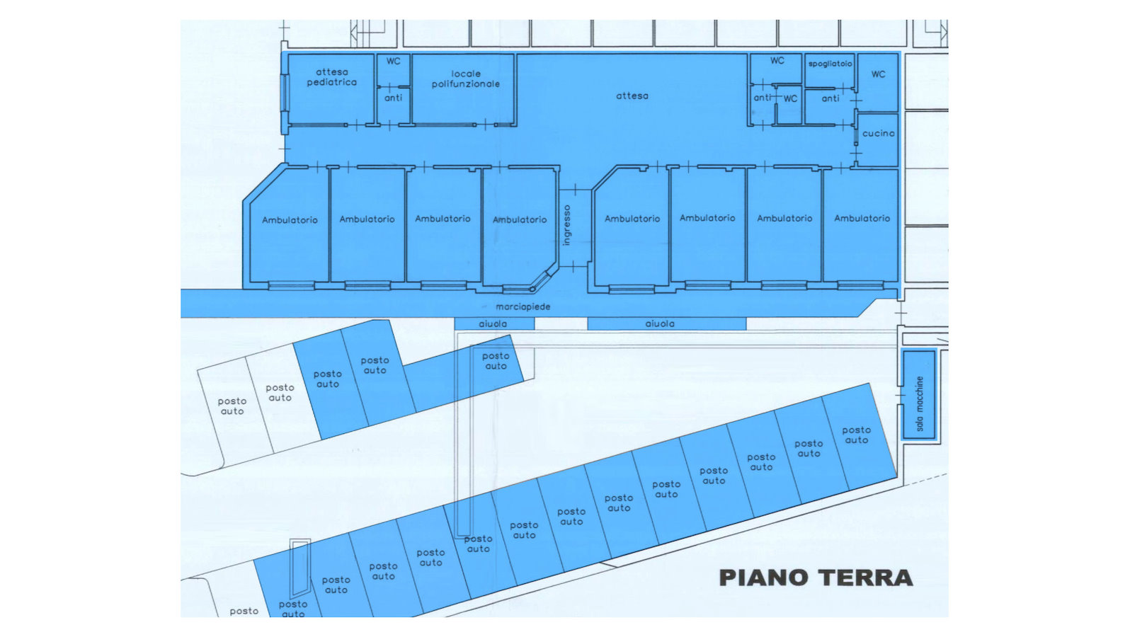 Si trova al piano terra di un elegante edificio e sono composti da due ingressi, ampia sala d'attesa, ufficio, ulteriore sala d'attesa, sala polifunzionale, cucina per il personale, anticamere e spogliatoio per il personale, quattro WC, cortile, sala macchine (impianto di climatizzazione) e sedici posti auto.