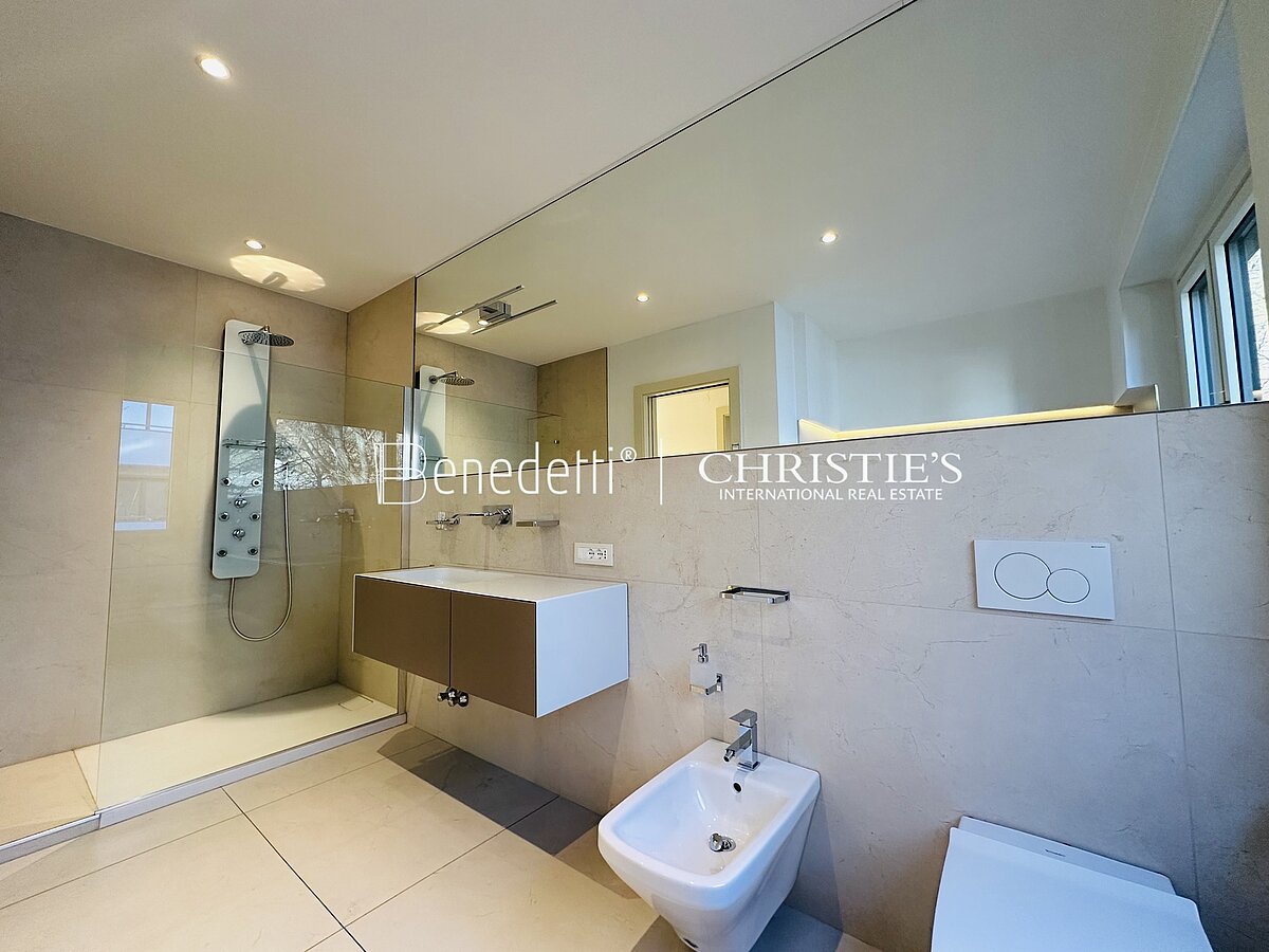 Una scala conduce al piano superiore, dove un luminoso disimpegno porta a un ulteriore spazio versatile, ideale come camera da letto o accogliente soggiorno. Da qui si accede a un piccolo balcone esposto a nord-ovest e a un’ampia terrazza soleggiata con una splendida vista a sud-est, perfetta per chi ama la vita all'aria aperta. Un secondo bagno moderno con lucernario aggiunge ulteriore comfort.