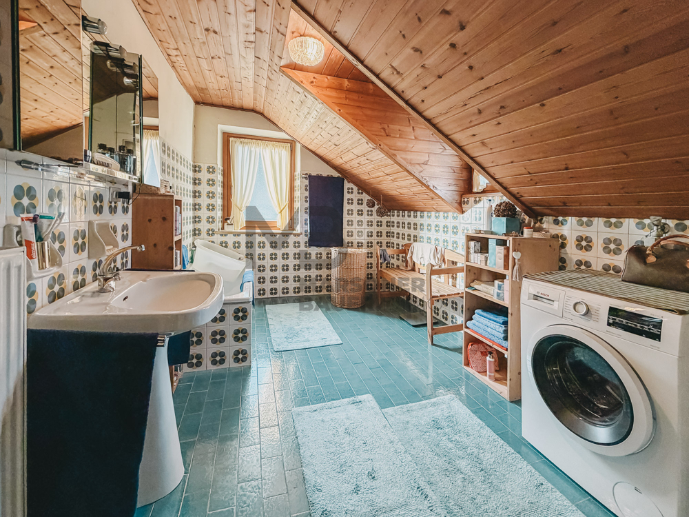 2º piano/mansarda: l'appartamento è composto da un ampio ingresso con camino e angolo ufficio, soggiorno, cucina abitabile, grande bagno, camera da letto matrimoniale e per bambini e balcone con vista panoramica sulle montagne;