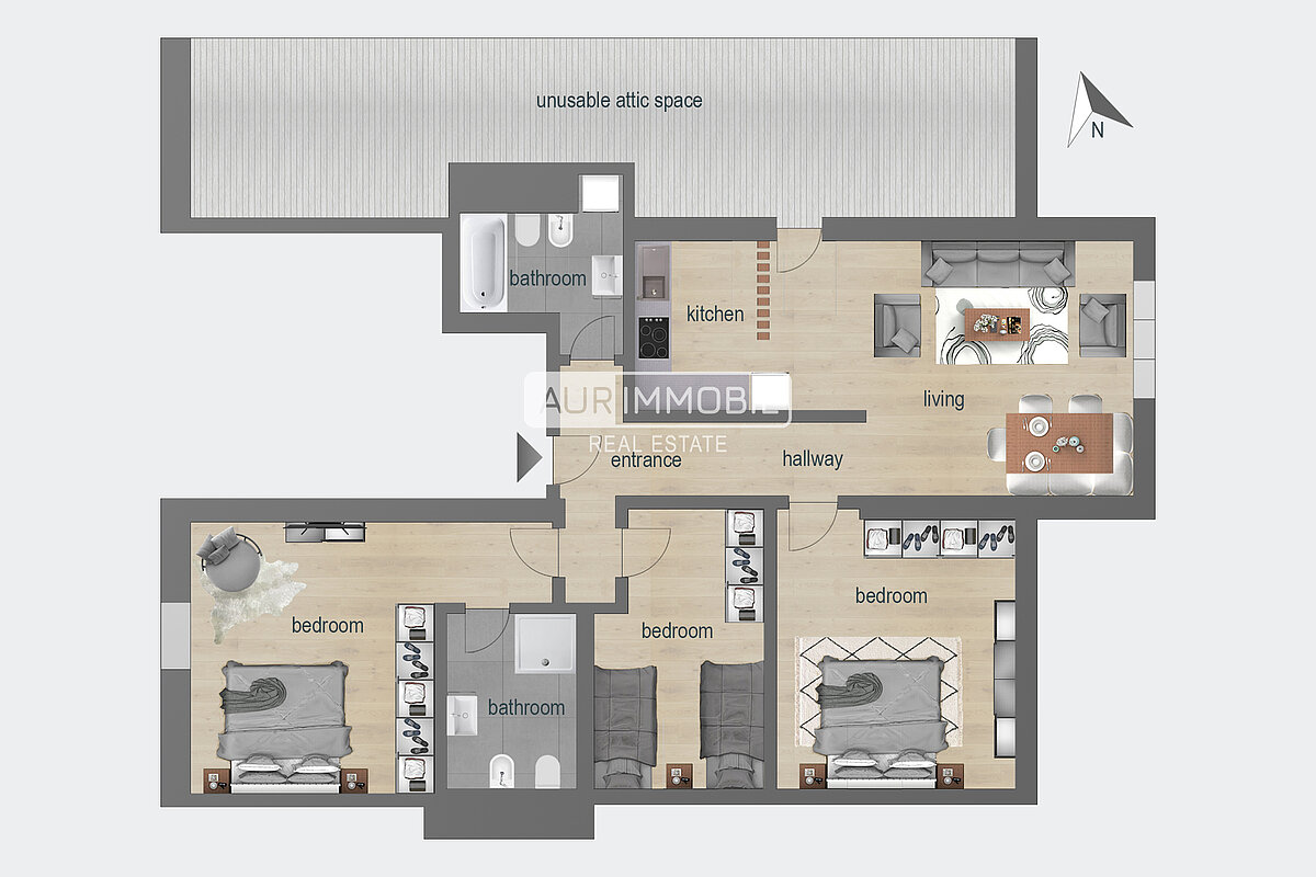 L’appartamento accoglie con un ampio soggiorno, caratterizzato da un caldo ambiente in legno e da un pratico angolo cottura. La zona notte comprende tre comode camere da letto, di cui una con bagno privato, un ulteriore bagno e un funzionale corridoio che collega gli ambienti.