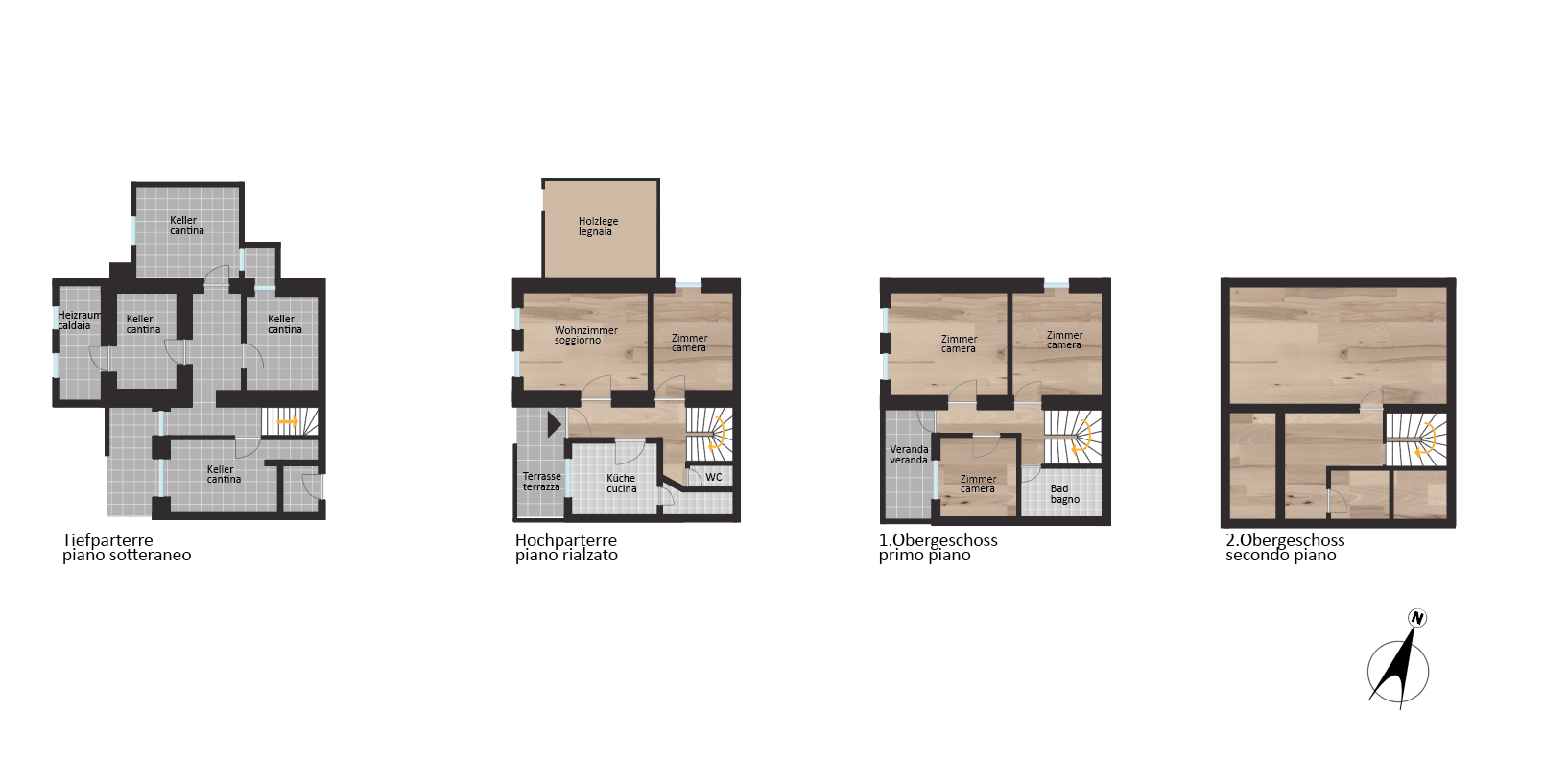 ✔ Piano terra rialzato: cucina con dispensa, soggiorno, WC, camera e terrazza.