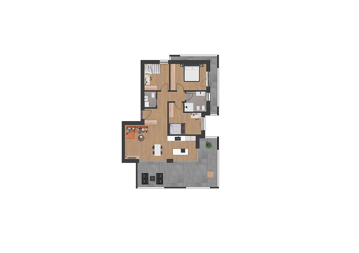 Questo moderno appartamento si trova al primo piano di un nuovo edificio residenziale a Merano e si distingue per una distribuzione degli spazi chiara ed equilibrata. La luminosa zona living con cucina abitabile si apre sulla terrazza privata e crea un’atmosfera accogliente con molta luce naturale. Le tre camere da letto offrono spazio sufficiente e possibilità di utilizzo flessibile, mentre due bagni garantiscono ulteriore comfort. Una cantina privata assicura un pratico spazio di deposito e un balcone completa le superfici esterne.