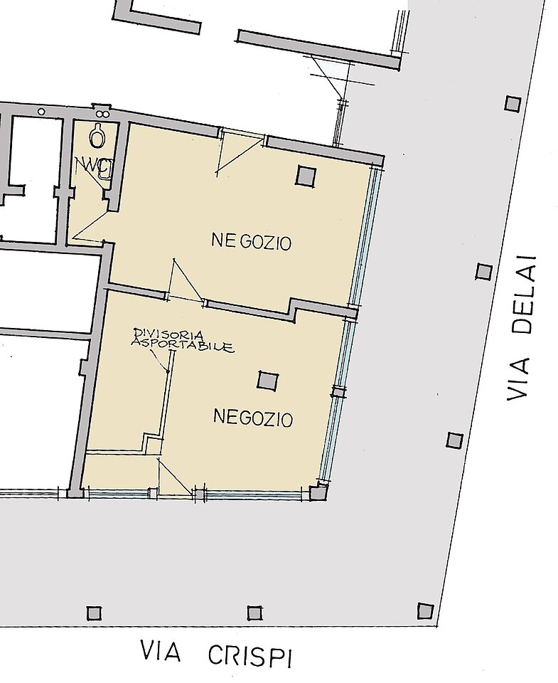 Ci sono due grandi vetrine con porta d’ingresso verso via Crispi e tre vetrine verso via De Lai.