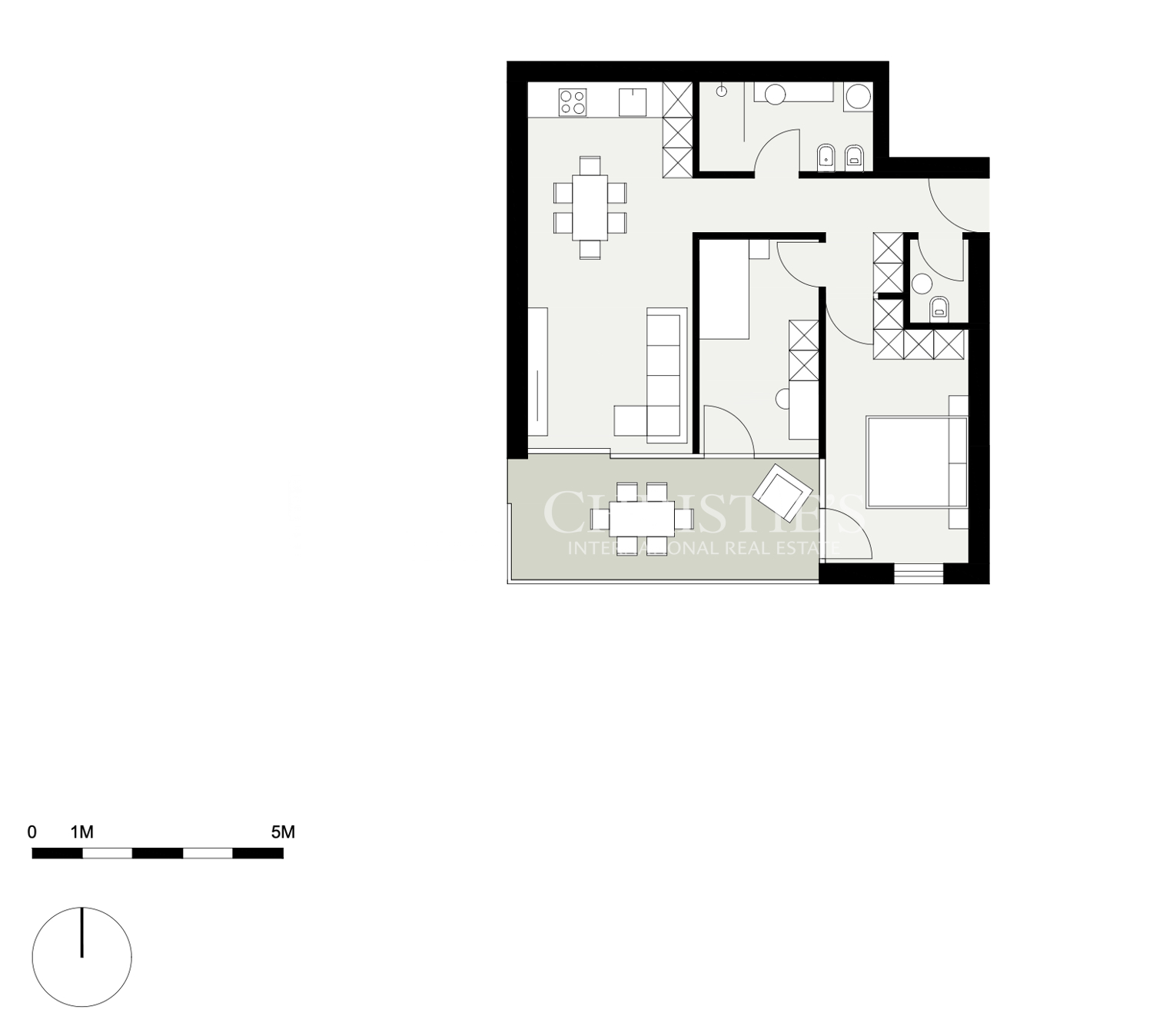 L'appartamento è composto da una luminosa zona giorno con angolo cottura, due camere da letto, ciascuna con accesso diretto alla terrazza, un bagno principale e un WC diurno separato. La proprietà comprende anche un locale cantina.