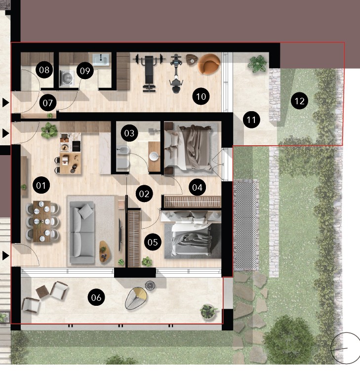 L’appartamento dispone di un ulteriore terrazza e di un piccolo giardino privato, un’oasi di relax e tranquillità. Sono inoltre disponibili due posti auto in garage, acquistabili separatamente. Per un’esperienza di vita completa, è presente anche una piscina condominiale, per momenti di convivialità e benessere.