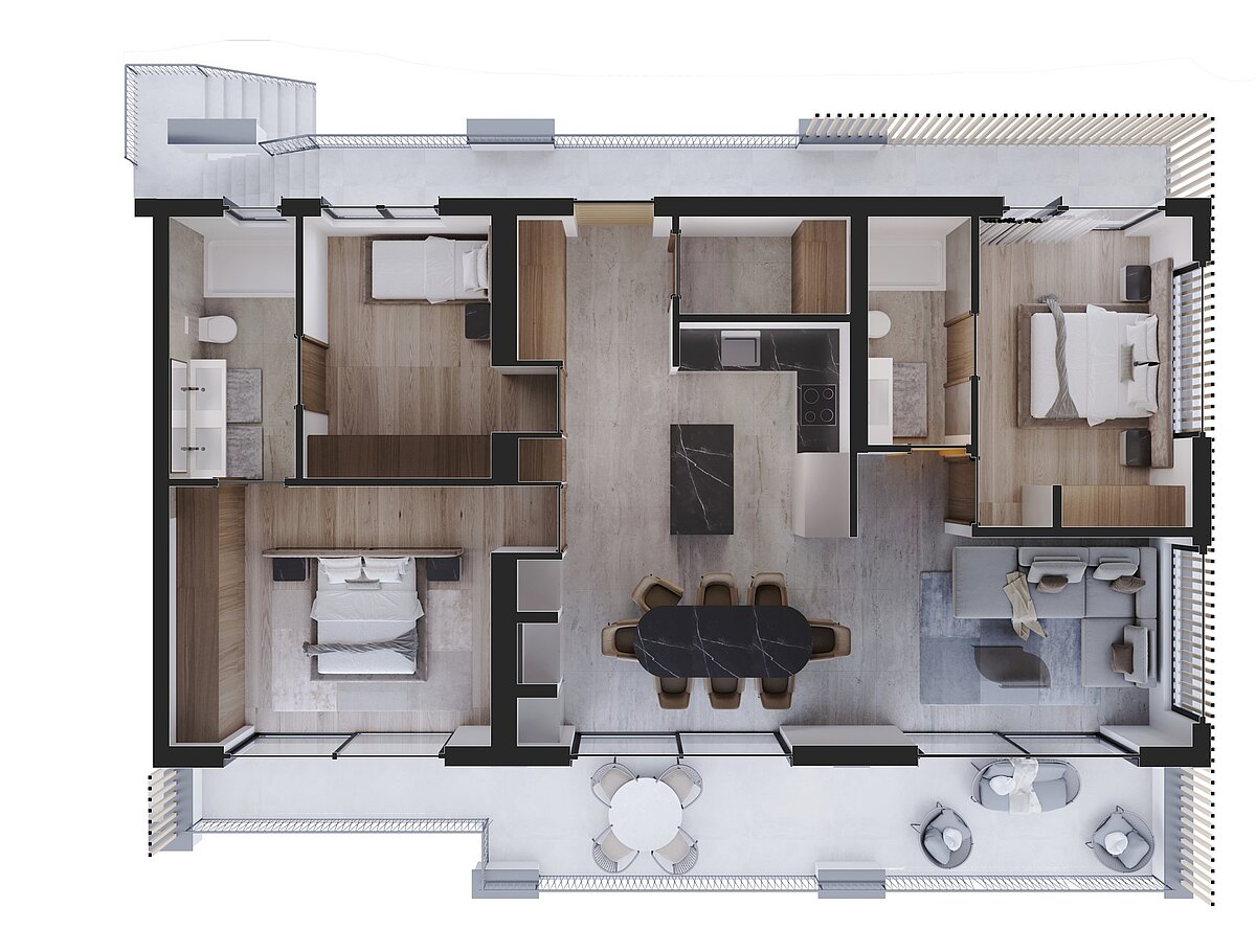 I rendering degli interni sono pensati per offrire uno sguardo ispirazionale su come potrebbe svilupparsi l’atmosfera degli ambienti. Non rappresentano una proposta di arredamento vincolante, ma più una suggestione stilistica e spaziale di quella che potrebbe diventare la vostra futura casa.