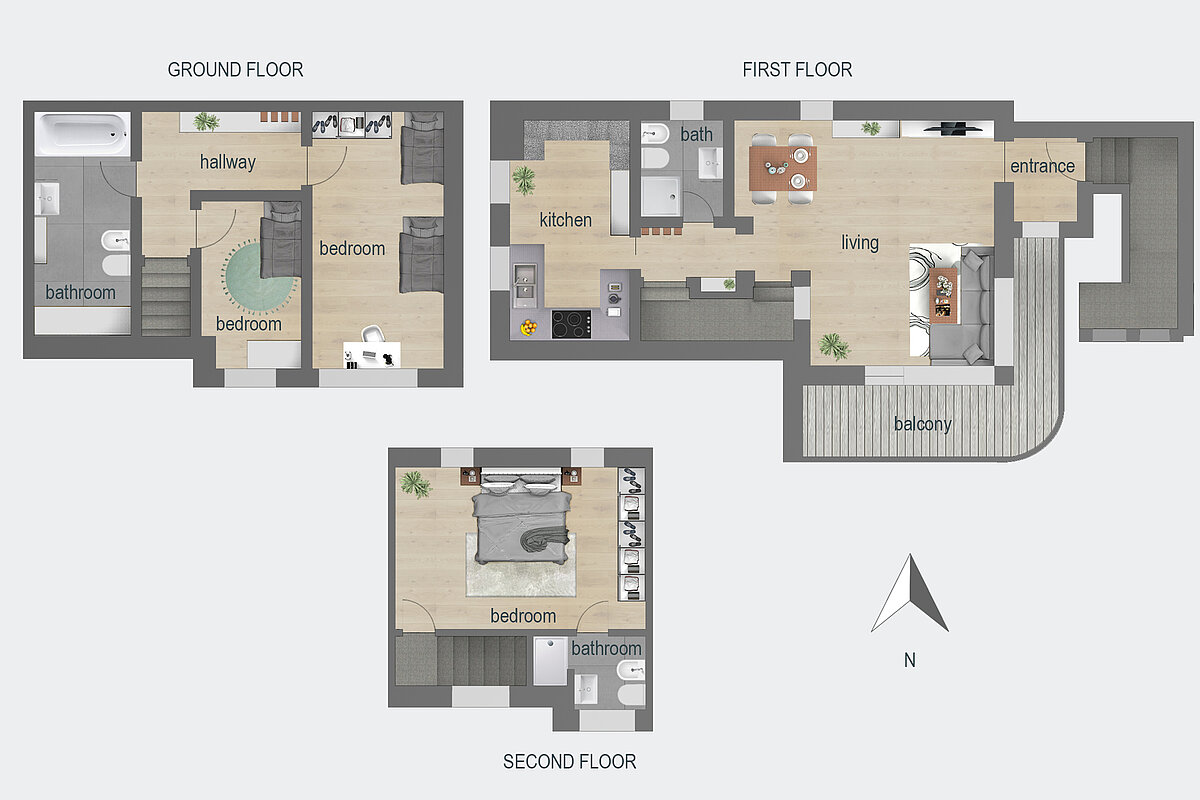 La porzione di casa si sviluppa su tre piani ed è composta da due camere da letto ed un bagno al piano terra. Una scala porta al primo piano con ingresso, soggiorno, cucina, bagno e ampio balcone. Al piano mansardato si trovano una camera da letto ed un ulteriore bagno.