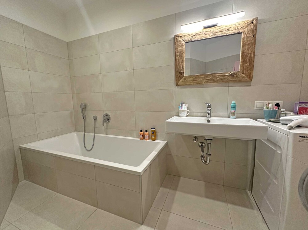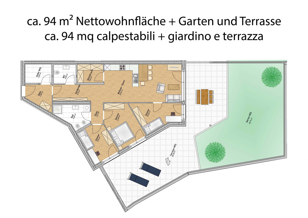 Con una superficie abitabile netta di circa 94 m², l'appartamento vanta una disposizione degli ambienti ben studiata con tre camere da letto, un'ampia zona giorno e pranzo, due bagni (uno con vasca e uno con doccia), un ripostiglio nonché un guardaroba, un disimpegno e un corridoio. Particolarmente degni di nota sono gli ampi spazi esterni: Una terrazza di quasi 70 m² e un giardino di circa 65 m² offrono molto spazio per rilassarsi, fare giardinaggio o giocare.