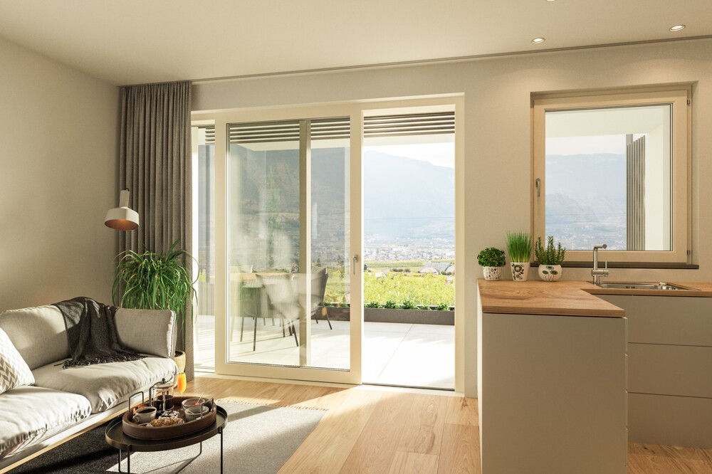 Questo quadrilocale al 1° piano offre circa 87 m² di superficie abitabile netta con luminosa cucina abitabile, tre camere da letto, due bagni con bidet, doccia e vasca. Tre terrazze esposte a sud, ovest ed est garantiscono spazi esterni soleggiati in ogni momento della giornata.È possibile acquistare separatamente una cantina, un box garage o un posto auto esterno.La certificazione CasaClima A è sinonimo di edilizia sostenibile, efficienza energetica e comfort abitativo di alta qualità.