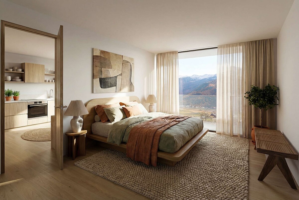 Tutti gli appartamenti si distinguono per l’ottimale esposizione a sud con ampie terrazze soleggiate, che offrono ulteriore spazio abitativo all’aperto e una piacevole vista sul paesaggio montano circostante.