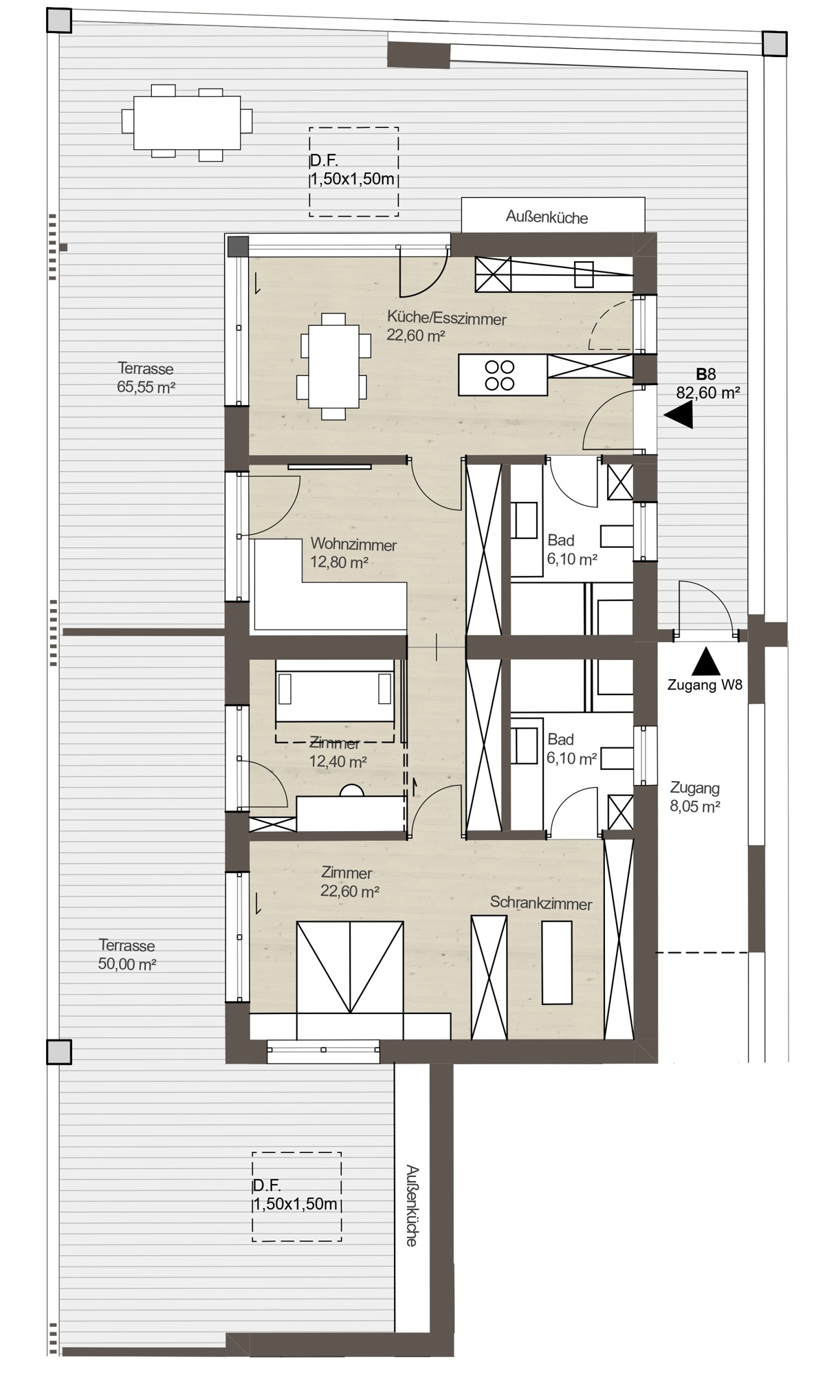 La suddivisione interna degli spazi, le ampie finestre, le zone giorno, nonché i generosi spazi aperti assicurano il massimo comfort abitativo. Ogni unità abitativa è dotata di ampie terrazze soleggiate o giardino, riscaldamento a pavimento regolizzabile autonomamente in ogni vano e numerosi dettagli di alta qualità.