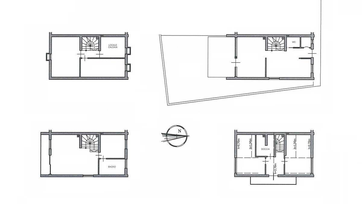 Nel seminterrato si trovano la centrale termica e due generose cantine; al piano terra guardaroba, doccia-Wc, sala da pranzo, vano cucina e soggiorno, terrazza, giardino e posto auto; al primo piano soggiorno, balcone, camera, doccia_WC; al secondo piano (mansarda) due camere, doccia-WC e balcone.