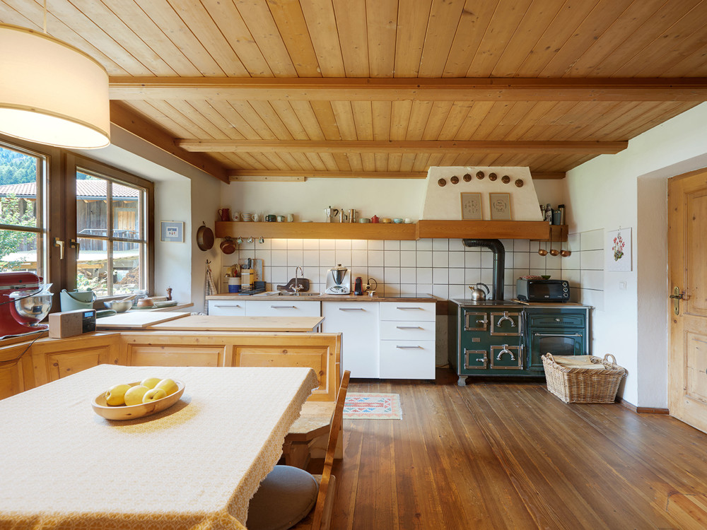 PIANO TERRA: ingresso, splendida stube rustica con stufa a legna, ampia cucina abitabile, 3 camere da letto, bagno, WC, officina