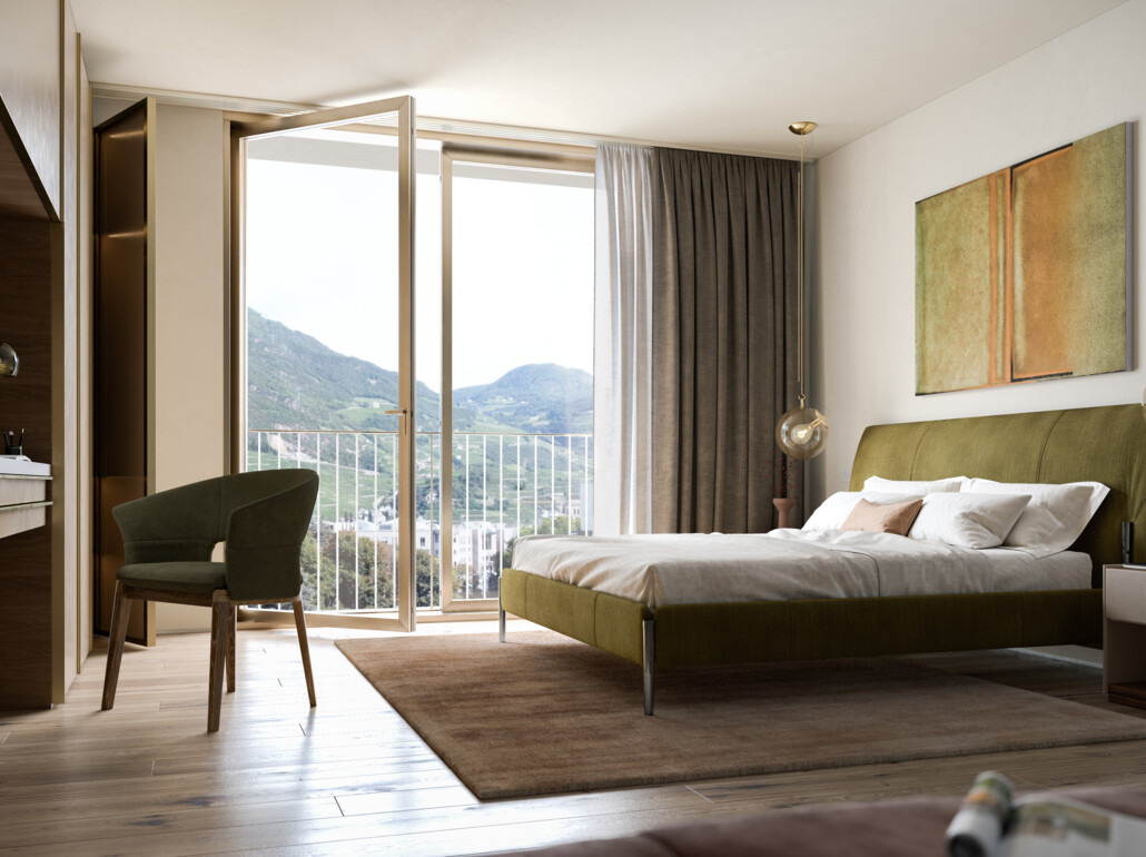 Le ampie vetrate panoramiche spiccano e conquistano a prima vista: da qui la vista sulla città di Bolzano e sul parco circostante è unica. Il design moderno e identitario, composto da materiali eco-friendly, si integra alla perfezione con il territorio: Materiali e finiture che rispettano appieno il valore della sostenibilità. La creatività artigiana Made in Italy si mescola sapientemente a uno stile minimal, eclettico e graffiante.