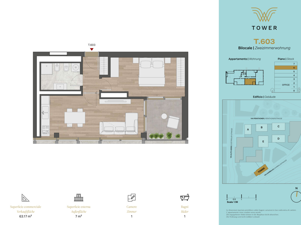 APPARTAMENTO T603 - WaltherPark Tower: Proponiamo in vendita nuovo, bellissimo bilocale con terrazza al sesto piano - disposizione interna quanto segue: ingresso, soggiorno con cucina, stanza da letto, bagno e terrazza.