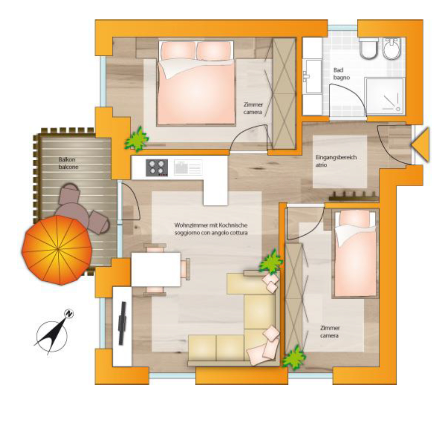 Il vivace centro di Brunico, con i suoi numerosi negozi, ristoranti, caffè, scuole e tutti i principali servizi, è raggiungibile in pochi minuti.