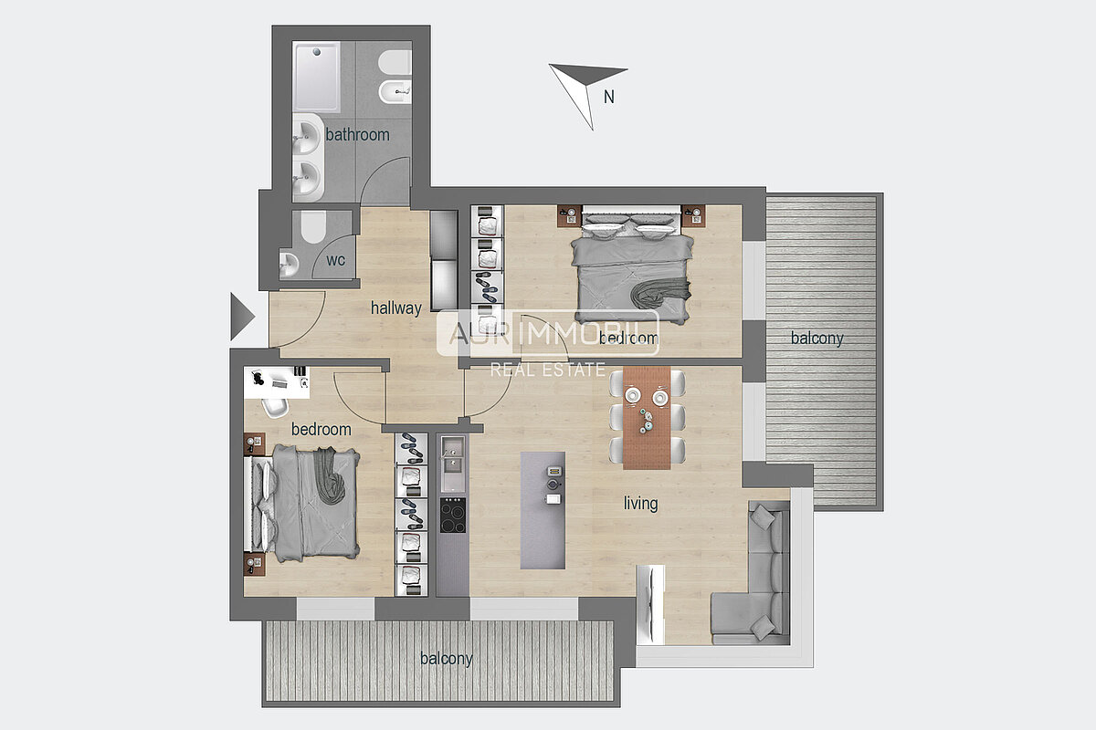Questo trilocale ad angolo sito al secondo piano è composto da un ingresso, una luminosa zona giorno con angolo cottura e panoramica vetrata in stile bow-window, due camere da letto, un bagno, un wc e due balconi.