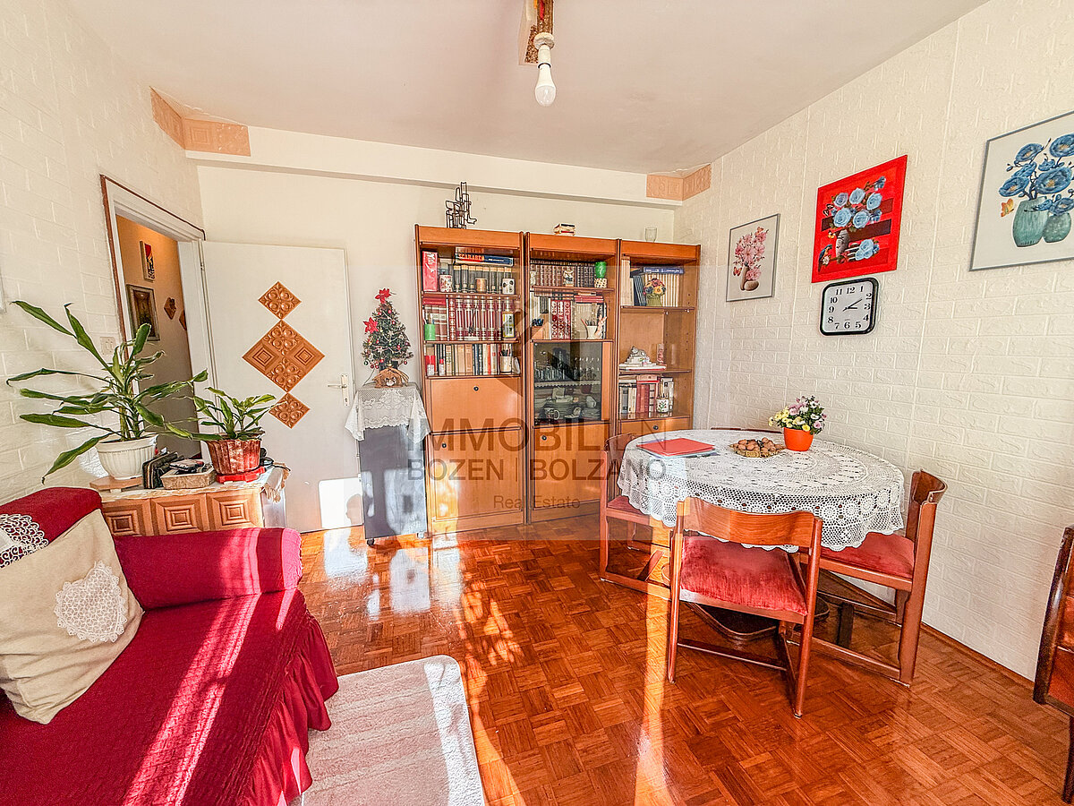 La disposizione interna è la seguente: ingresso con corridoio, cucina separata, ampio soggiorno, due spaziose camere da letto, bagno finestrato e due piccoli balconi. Completano la proprietà una cantina, un garage e posti auto condominiali. L’edificio non è dotato di ascensore.