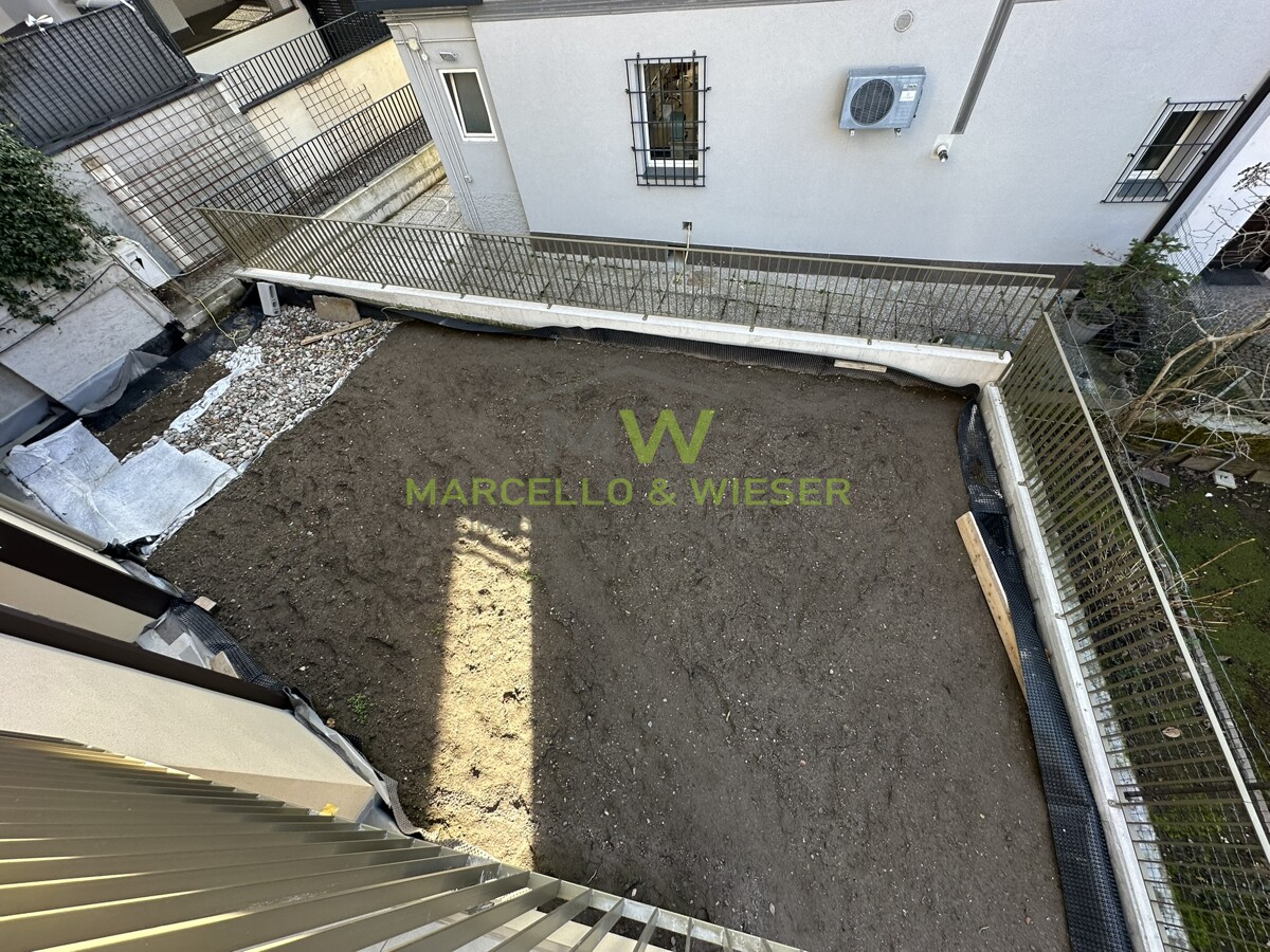 2 ingressi da 2 strade diverse, cortile, giardino privato (ca. 100m²), parcheggio privato, patio e atrio della villa.