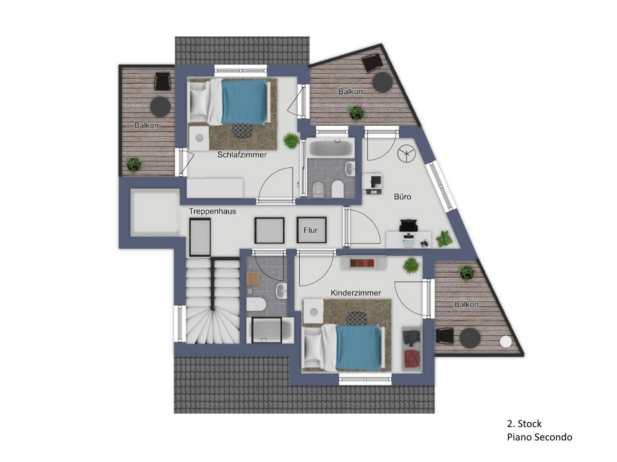 disimpegno, scala, 3 camere da letto, 2 bagni e 3 balconi