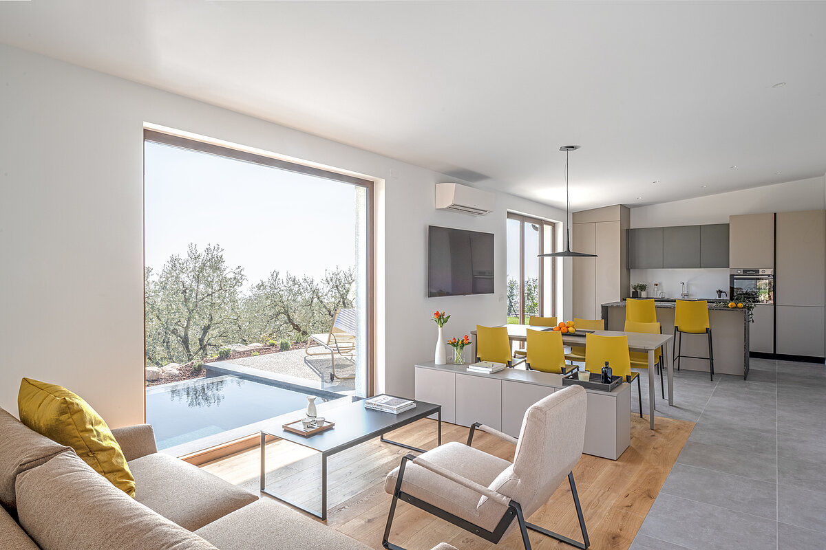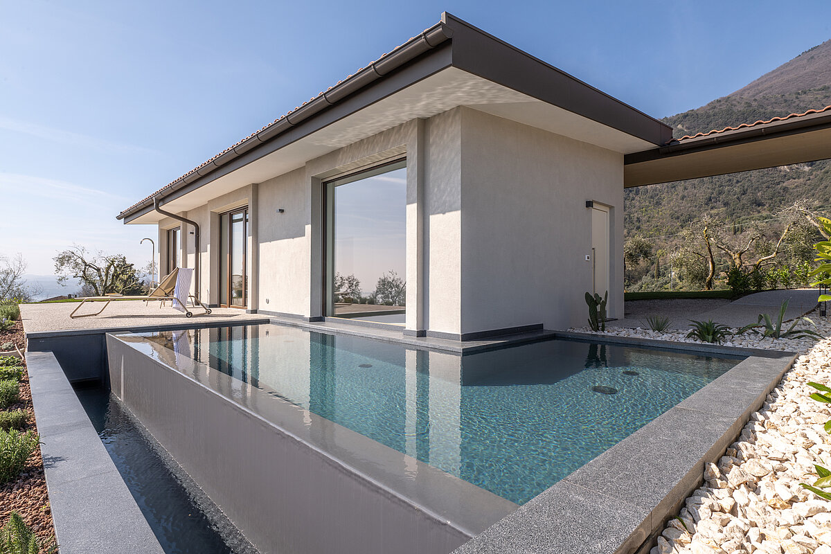 Questa villa di nuova costruzione con vista sul Lago di Garda è suddivisa in un ampio soggiorno e zona pranzo, due camere da letto e due bagni. All'esterno si trovano un'ampia terrazza, un giardino, una piscina privata e due posti auto esterni.