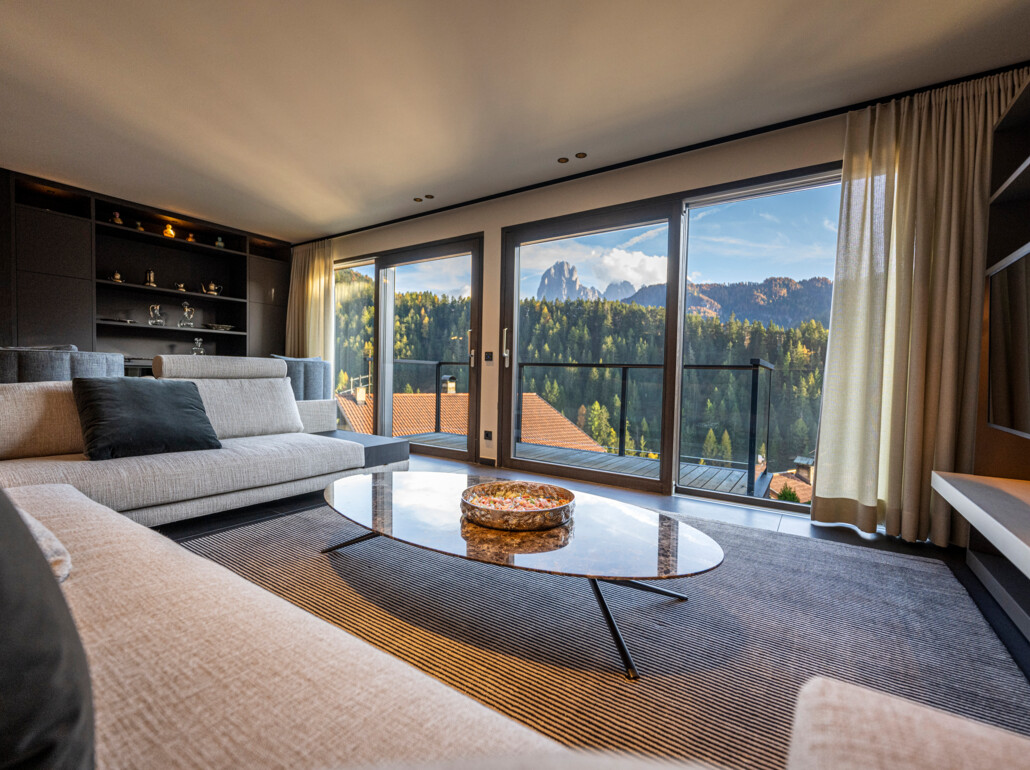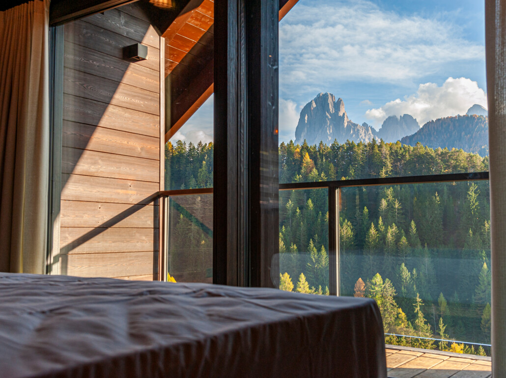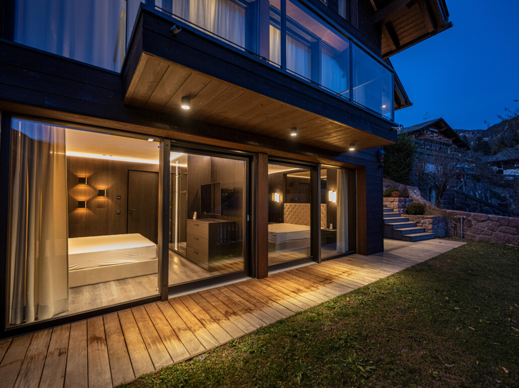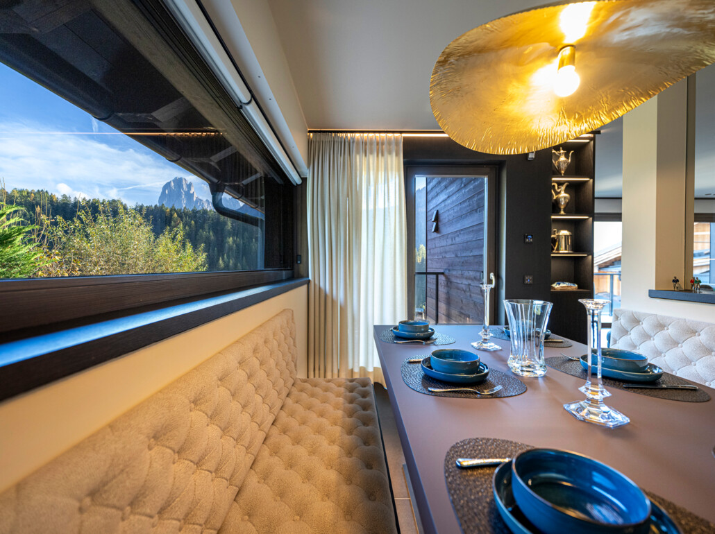Grazie alle vetrate a tutta altezza e senza telaio, lo spazio abitativo si fonde perfettamente con l'area esterna e permette di inserirsi nel mondo montano circostante.
