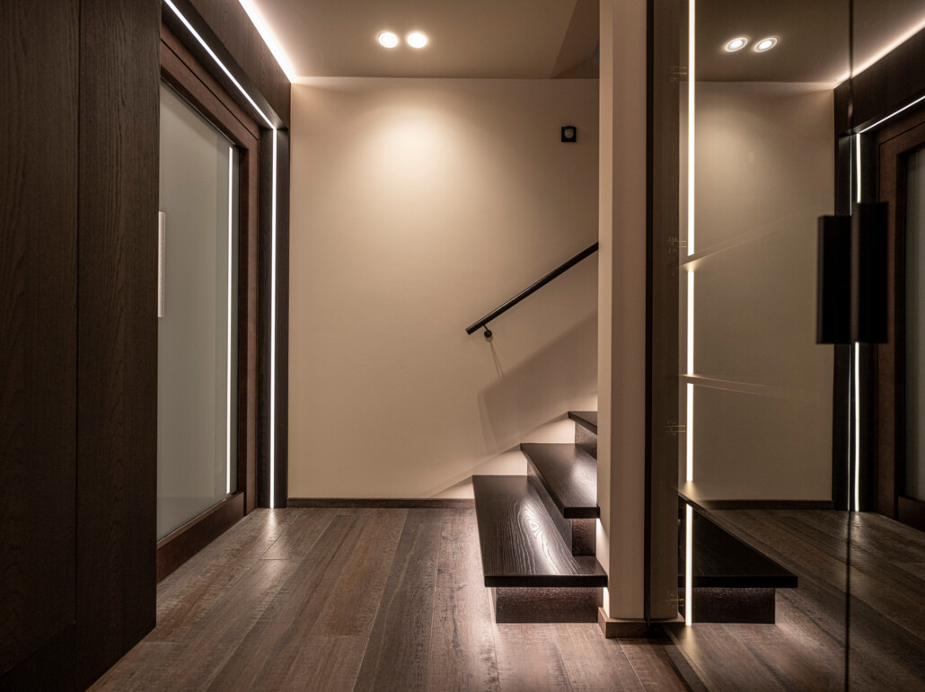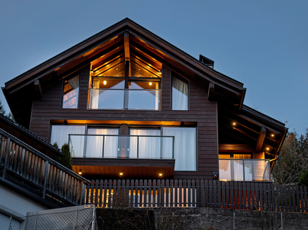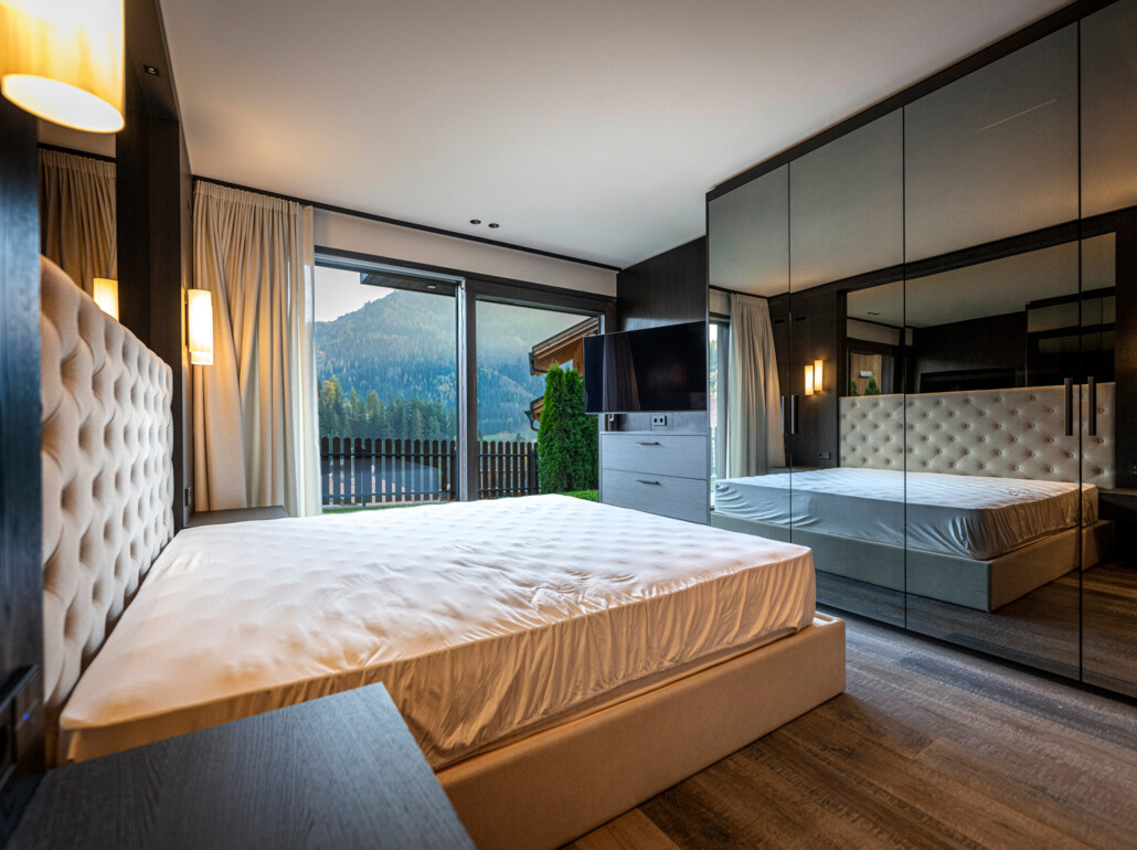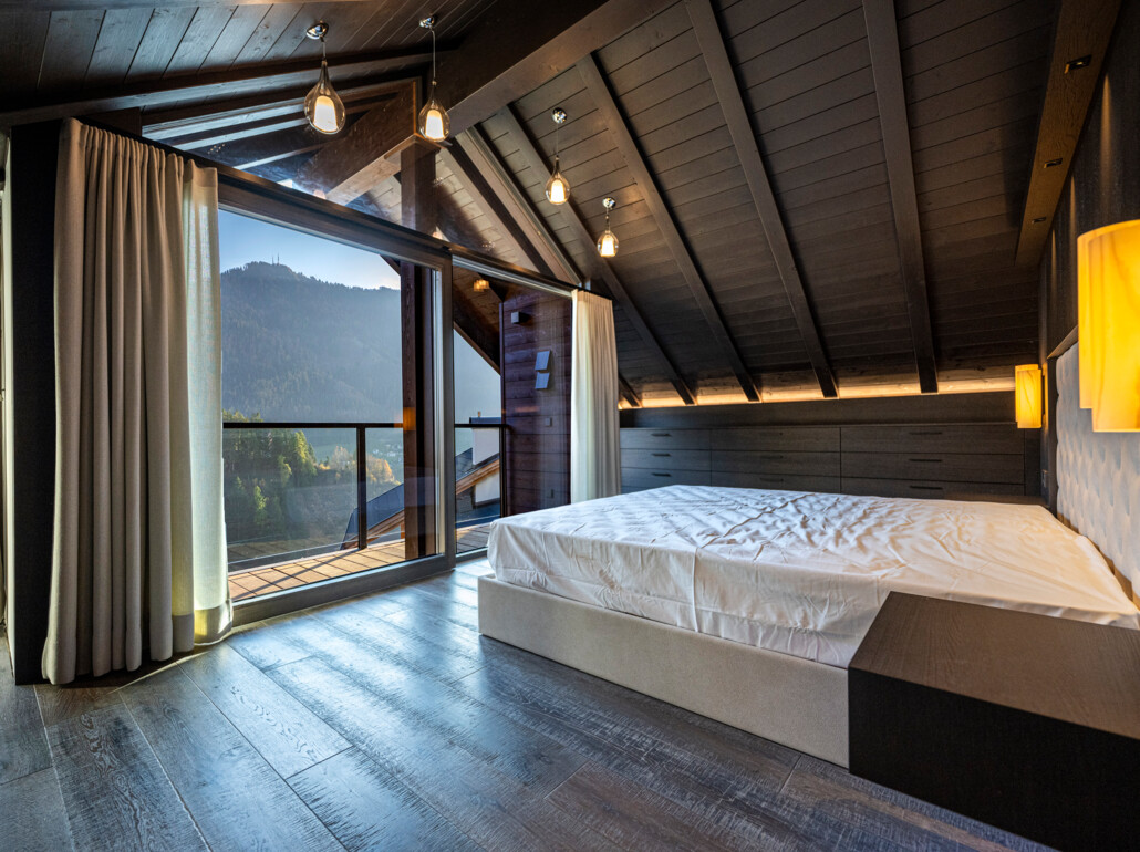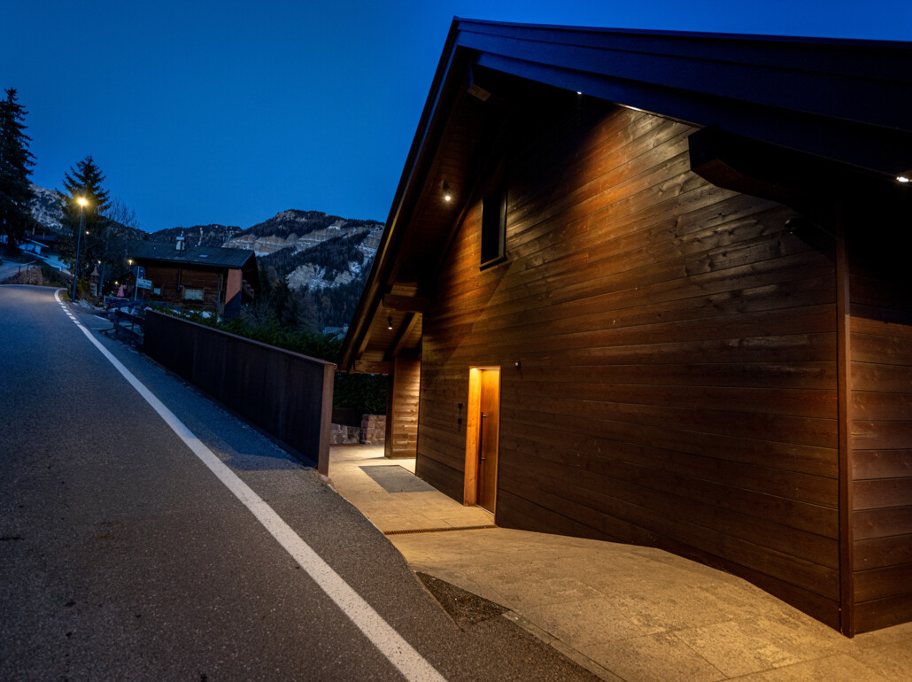 Grazie alle vetrate a tutta altezza e senza telaio, lo spazio abitativo si fonde perfettamente con l'area esterna e permette di inserirsi nel mondo montano circostante.