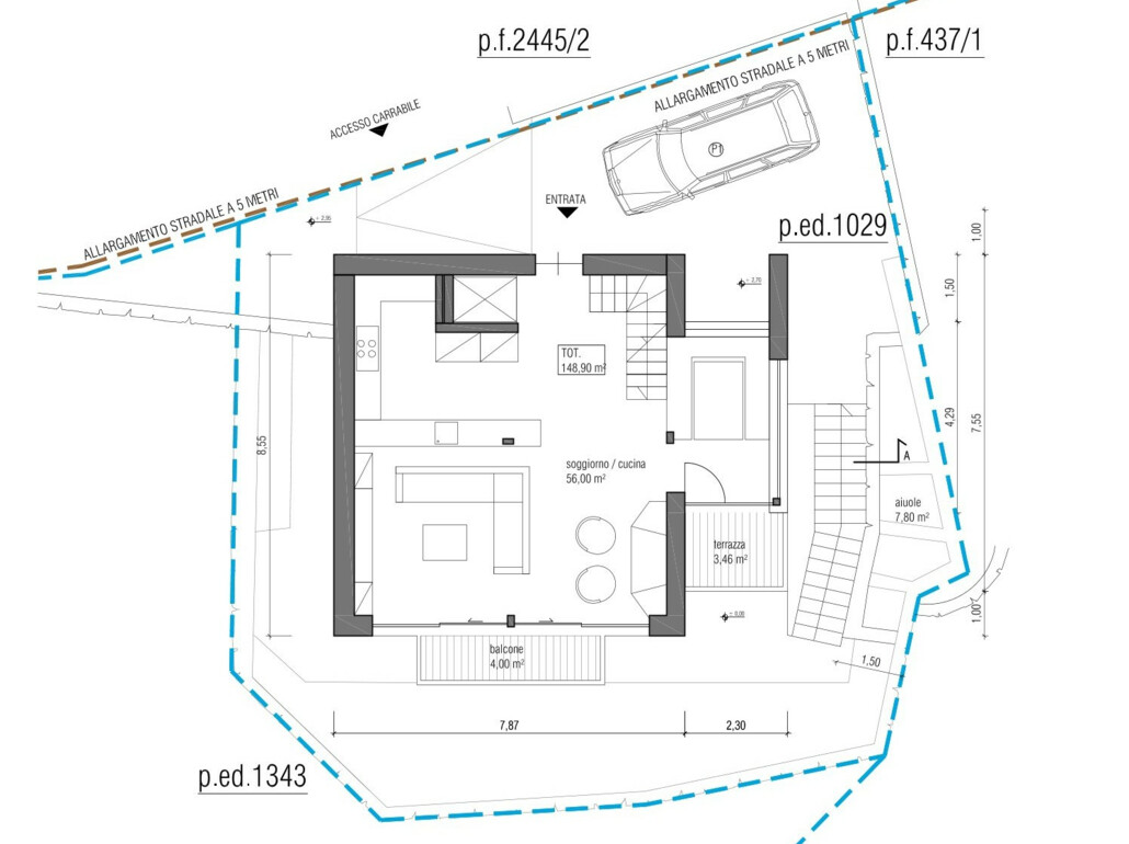 - Livello 1: ampio soggiorno con cucina e zona pranzo, ingresso, terrazza e balcone.