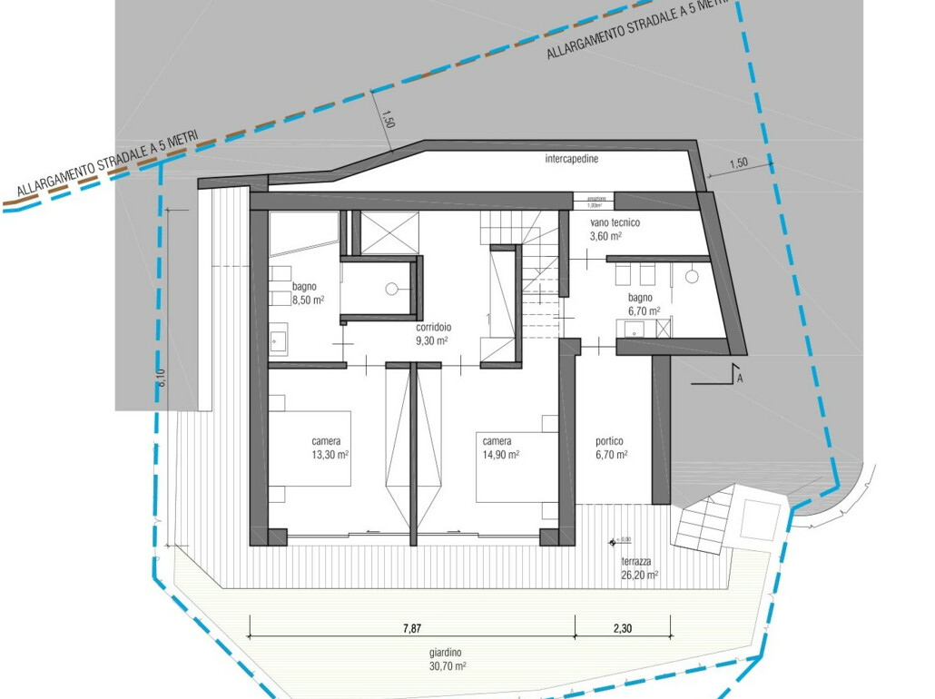 - Livello 0: 2 camere matrimoniali, 2 bagni, zona guardaroba, terrazza e giardino privato.