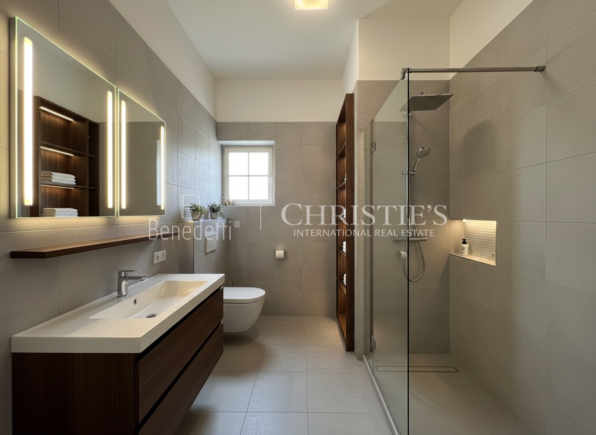 - Il più grande dei due appartamenti si distingue per materiali di alta qualità e rifiniture raffinate. Con una superficie abitabile di circa 150 m², offre un'atmosfera lussuosa e una sensazione di spazio senza pari – ideale come residenza principale di classe.