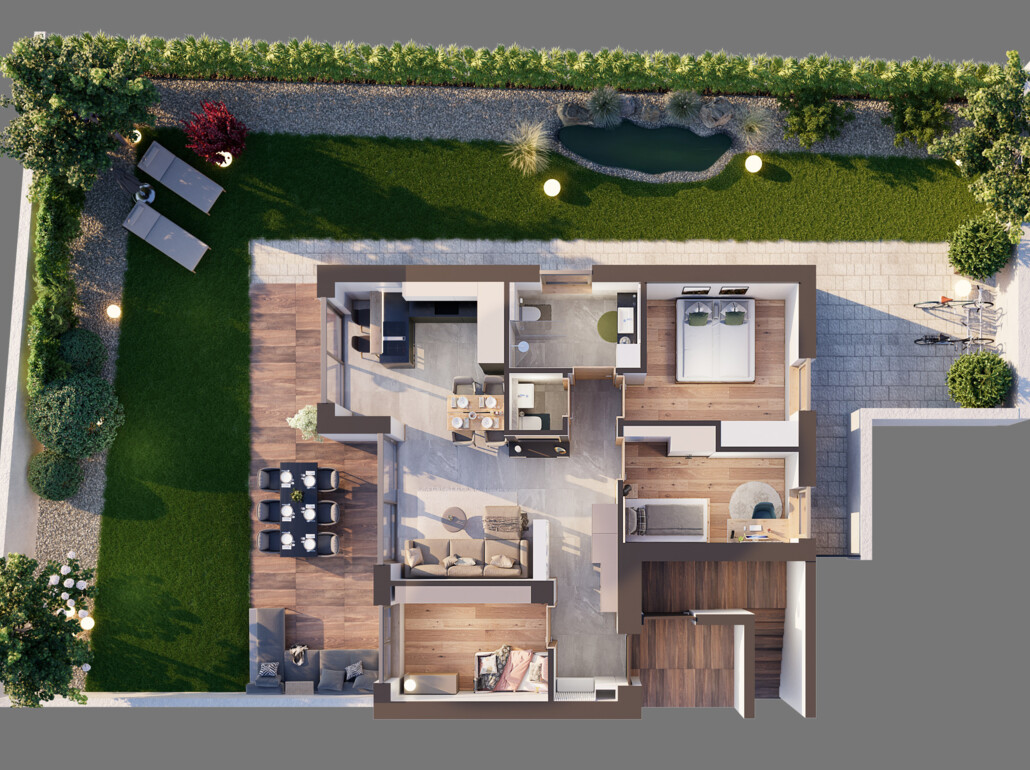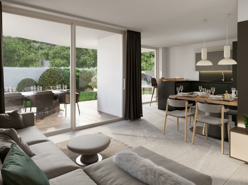 Divisione interna: ingresso, soggiorno con cucina, 3 camere da letto, bagno finestrato, bagno di servizio, terrazza e giardino privato. L’appartamento viene consegnato parzialmente arredato.