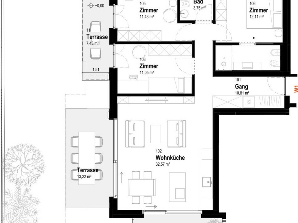W1: L'appartamento si trova al piano terra ed è composto da: ingresso, soggiorno con cucina, 3 stanze da letto, 2 bagni, terrazza e giardino privato.