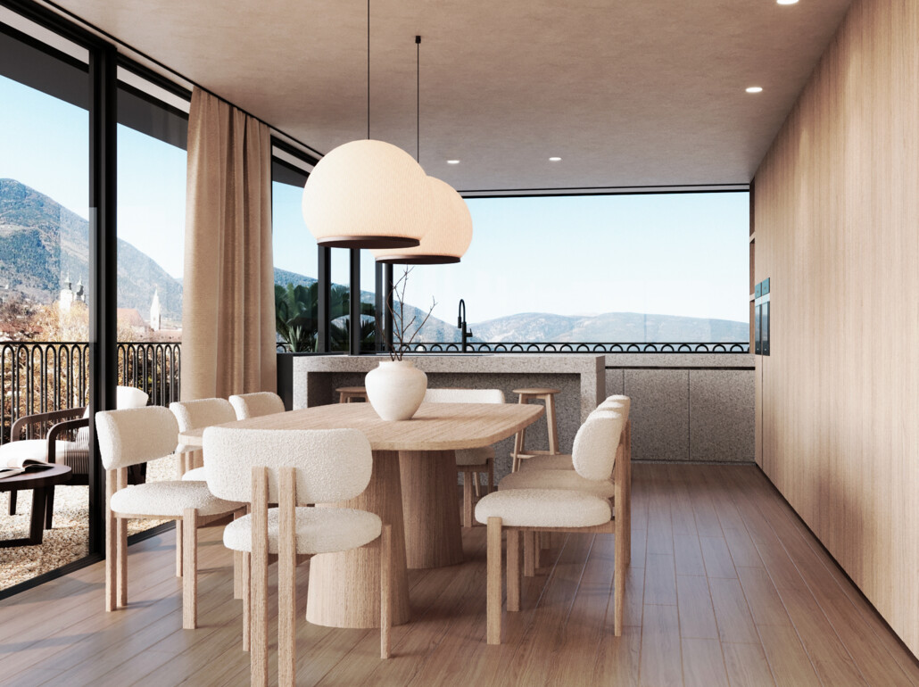 Le vetrate a tutta altezza, prive di cornice, permettono al soggiorno di fluire senza soluzione di continuità sulla terrazza panoramica. L'appartamento offre una vista spettacolare a 360 gradi.