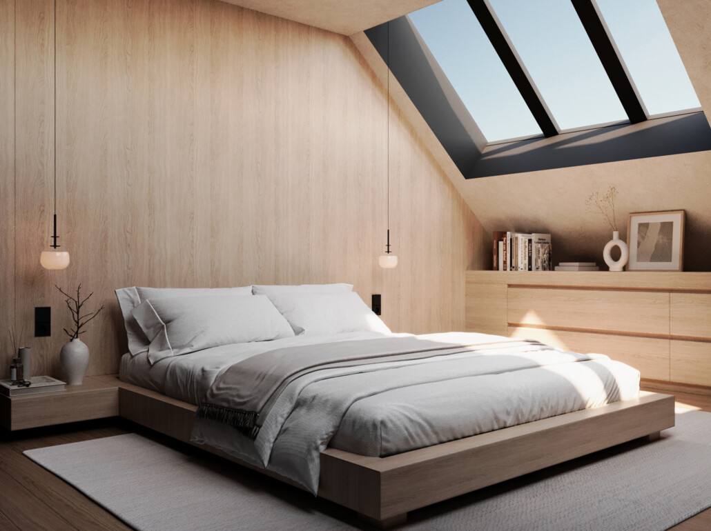 Finestre per tetti di alta qualità, realizzate su misura, che si estendono dall’altezza del parapetto fino al soffitto, garantiscono un’eccezionale luminosità naturale e una sensazione di spazio ampia e ariosa.
