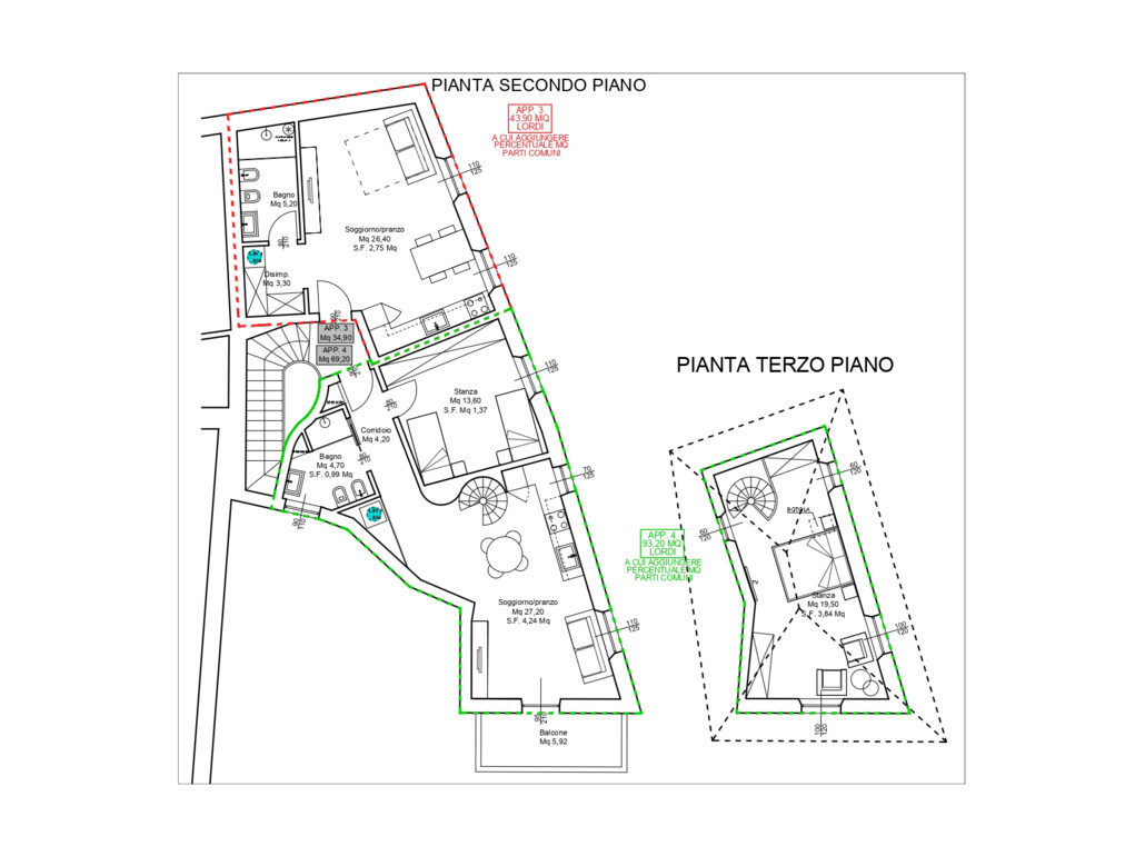 - Secondo piano: ingresso, soggiorno con cucina, stanza da letto e bagno finestrato